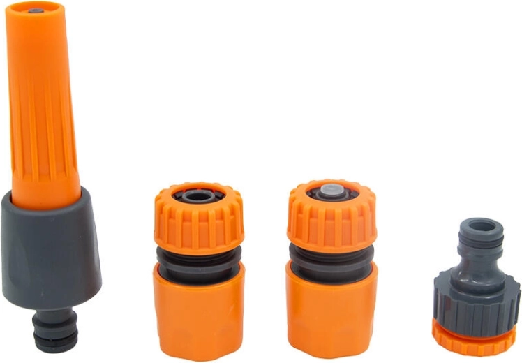 I pakken finder du alt, hvad du behøver for at komme i gang med det samme: 1/2" hurtigkobling med STOP-ventil til udskiftning af tilbehør uden at lukke for vandet, gennemløbende 1/2" hurtigkobling og adapter 1/2" + 3/4" for bred kompatibilitet med haner og slanger.