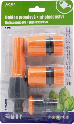 Universelt sæt til havevanding med AQUA strålepistol og praktiske koblinger, som sikrer nem tilslutning og trinløs justering af vandstrålen. Indeholder hurtigkoblinger 1/2" (STOP og gennemløb) samt adapter 1/2" + 3/4" for kompatibilitet med de fleste slanger og haner. Holdbar plastkonstruktion er let, nem at bruge og ideel til regelmæssig havepleje.