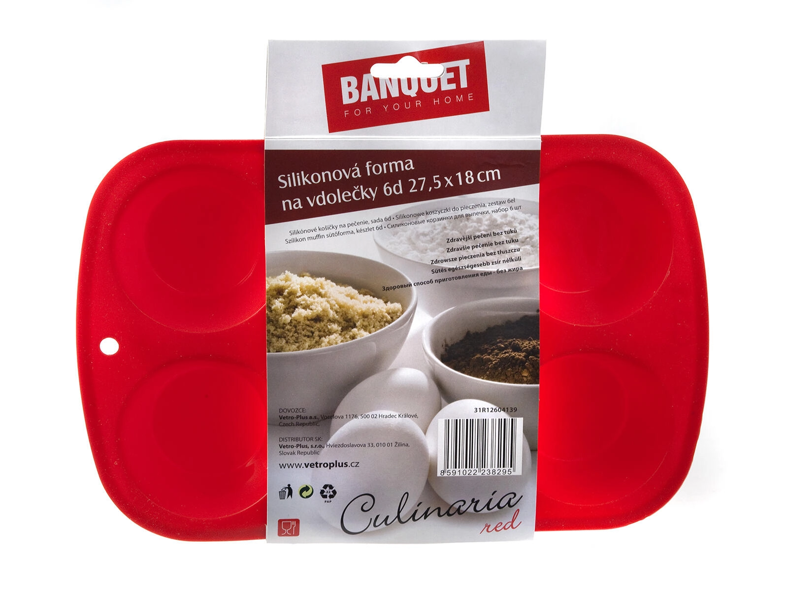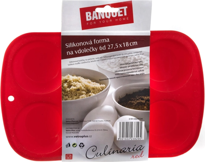 Den praktiske CULINARIA silikoneform til muffins til bagning af 6 stykker vil glæde enhver elsker af hjemmelavede desserter. Den tilbyder modstandsdygtighed op til 240 °C, er egnet til elektrisk og mikrobølgeovn, optager hverken smag eller lugt og kan vaskes i opvaskemaskinen. Takket være den fleksible silikone slipper muffinsene let, og formen er nem at vedligeholde.