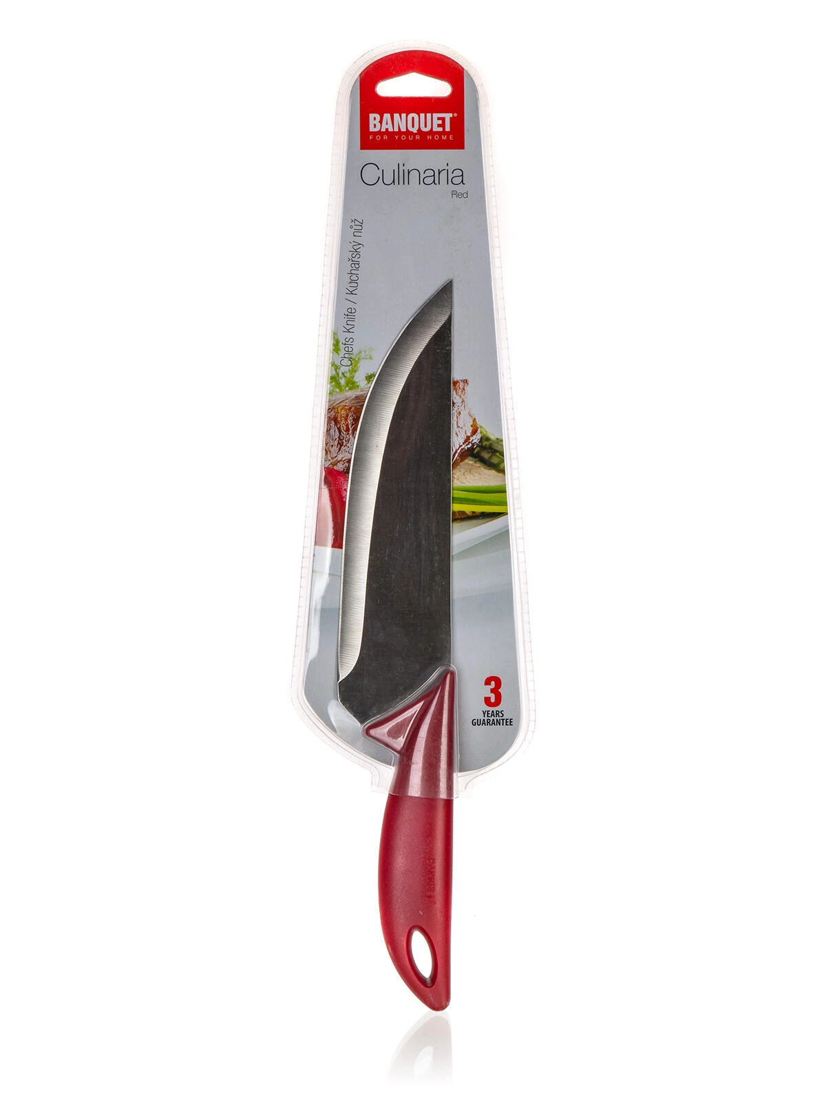 Universel kokkekniv med en bladlængde på 17 cm fra kollektionen CULINARIA RED, som tilbyder et skarpt stålblad og sikker, komfortabel skæring takket være det ergonomiske håndtag i plast. Et fremragende valg til daglig skæring, udskæring og hakning i hjemmekøkkenet.
