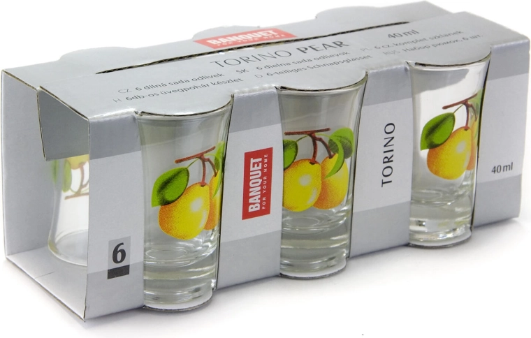 Stilfuld glasteske med pæremotiv, volumen 40 ml, i en praktisk pakke med 6 stk. Ideel til servering af spiritus derhjemme, på bar og i restaurant. Udskiller sig ved traditionelt design, kompakt størrelse og alsidig anvendelse.