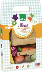 Trækurv med frugt og grøntsager er ideel til børnekøkkener. Den indeholder fem typer frugter og grøntsager, et skærebræt og en kniv, alt lavet af kvalitets træ.