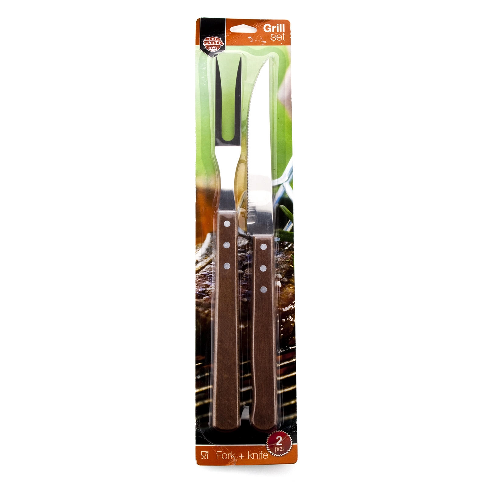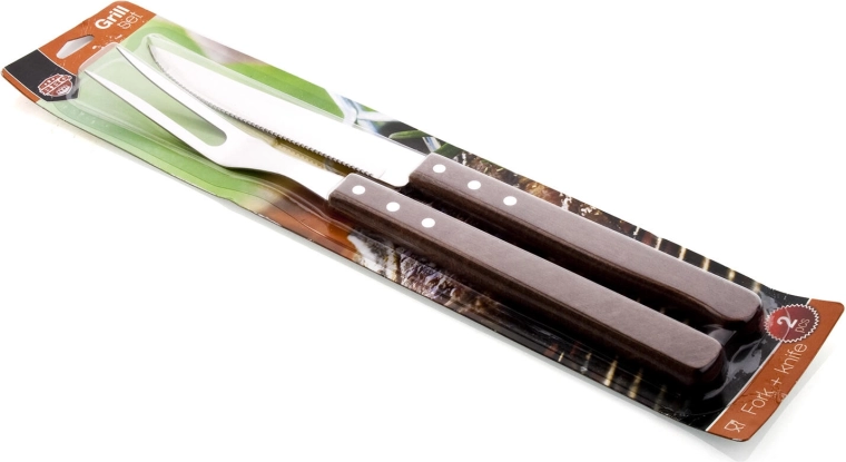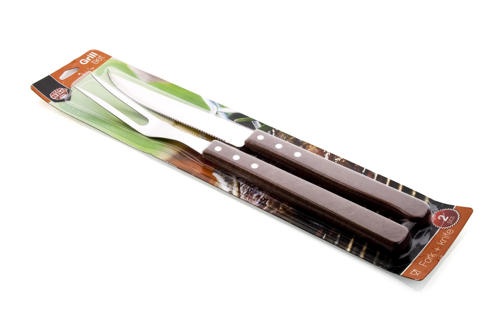 Praktisk steaksæt til grillning indeholder en savtakket kniv og en to-tandet gaffel i rustfrit stål med ergonomiske træhåndtag. Ideel til udskæring af steaks, portionsanretning og håndtering af kød ved grillen og ved bordet. Holdbar konstruktion, behageligt greb og rustikt look til stilfuld udendørsspisning.