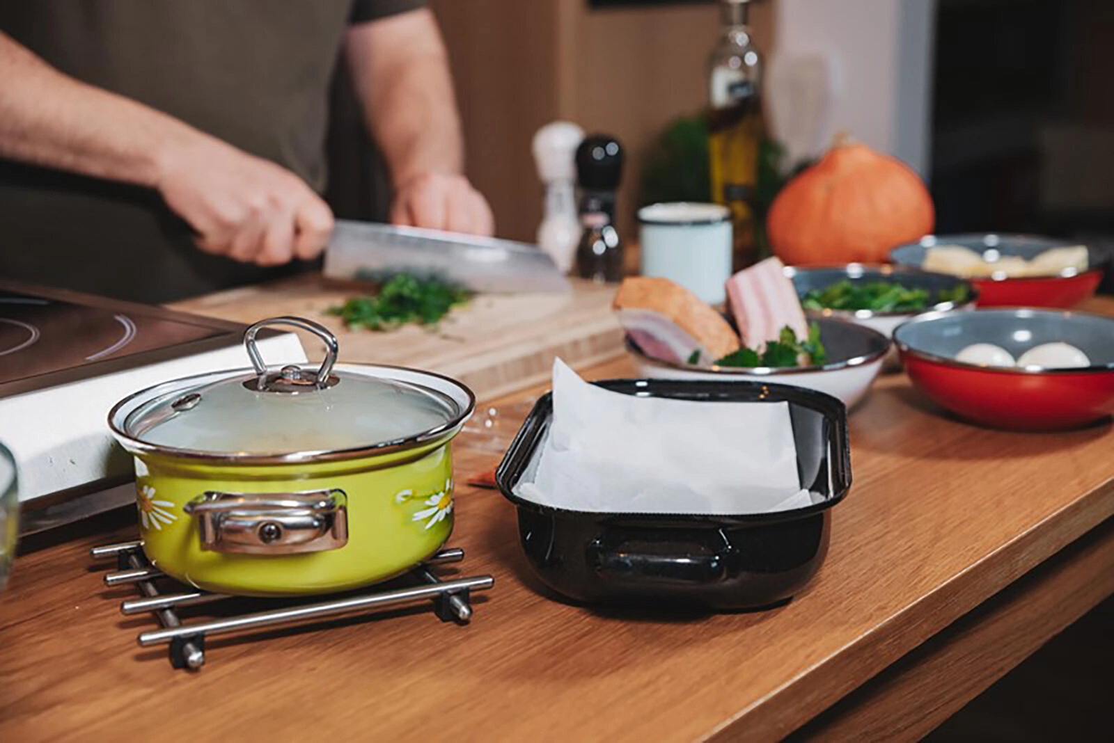 Den ikke-porøse emalje begrænser bakterievækst, frigiver ikke uønskede stoffer i maden og tåler opvaskemaskine.