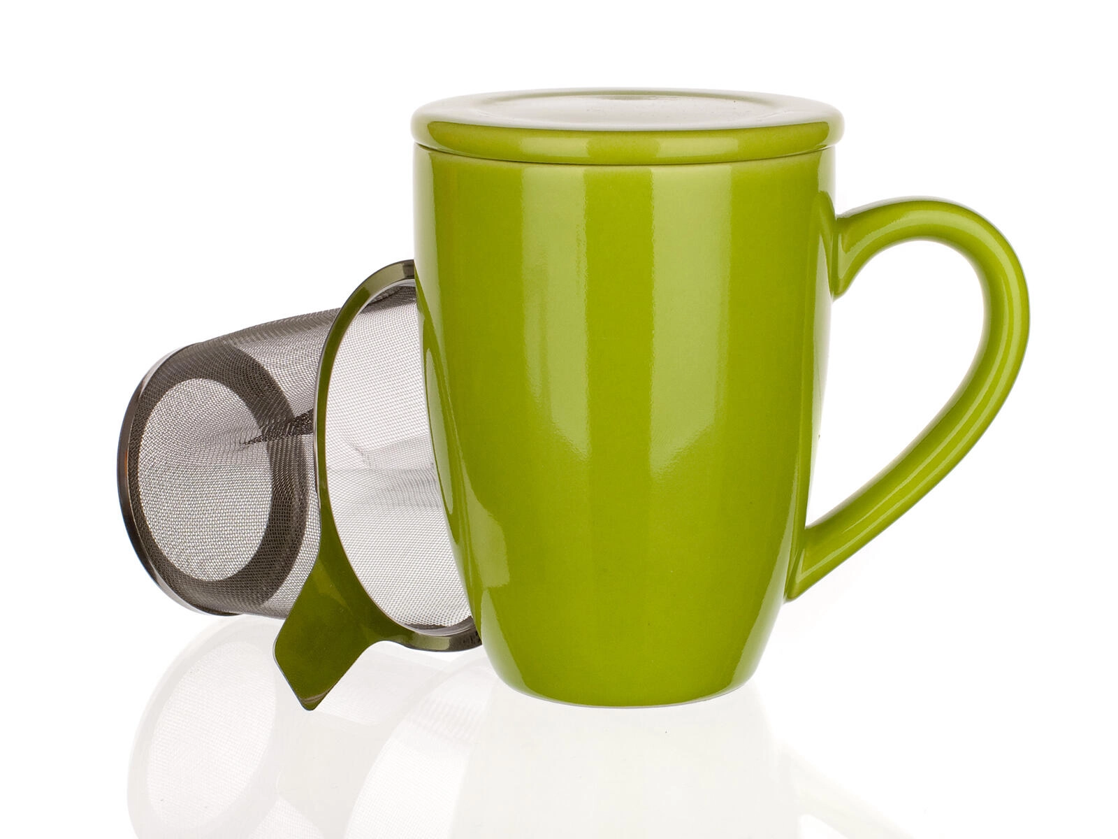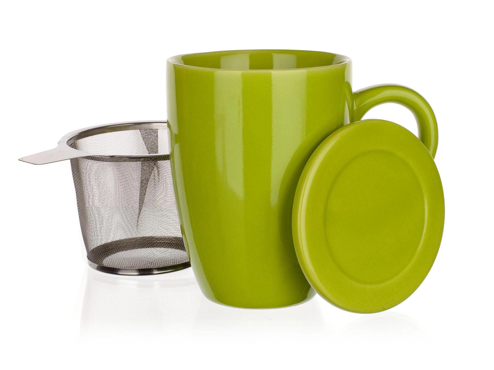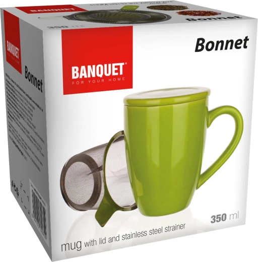 Stilfuldt grønt BONNET-krus på 350 ml med låg og integreret si i rustfrit stål er ideelt til elskere af løste. Det tilbyder praktisk brygning direkte i kruset, bedre varmeholdning takket være låget og nem vedligeholdelse – det tåler både opvaskemaskine og mikrobølgeovn.