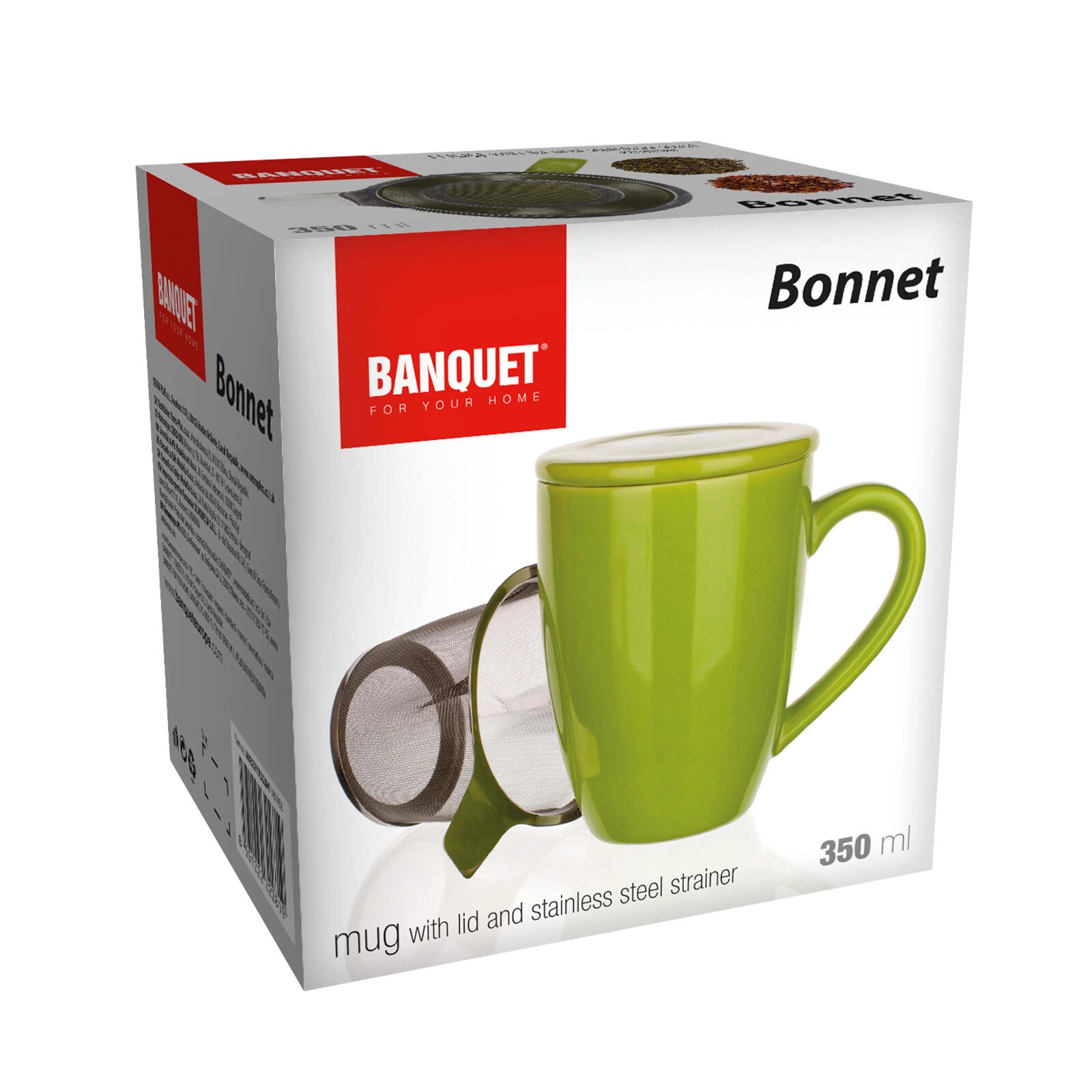 Nyd nem tilberedning af løste med BONNET-kruset. Kvalitetskeramik med blank grøn glasur ligger godt i hånden, låget hjælper med at holde drikken varm længere og fungerer efter brygning som en praktisk skål til sien.