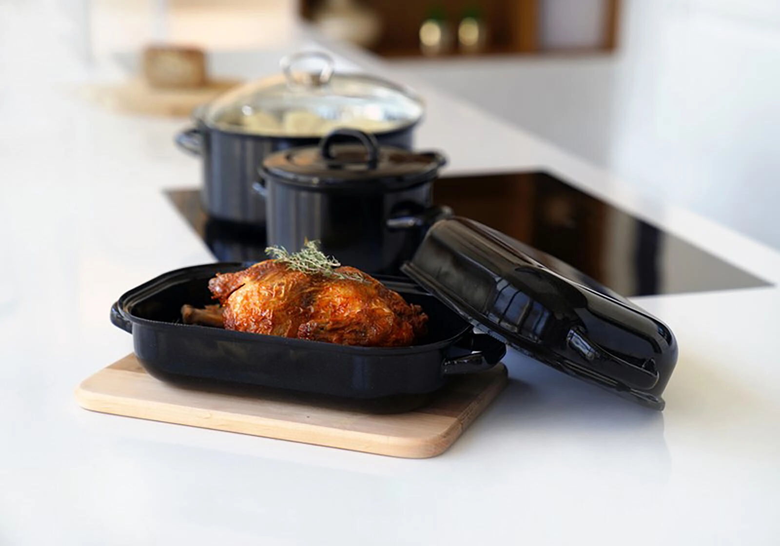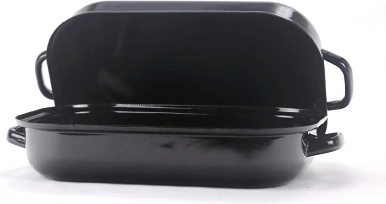 Robust bradepande i kvalitetsemalje med pladetykkelse på 1,2 mm tilbyder lang levetid og modstandsdygtighed over for ridser. Den glatte, ikke-porøse overflade er hygiejnisk, let at vedligeholde og begrænser bakterievækst. Låget hjælper med at holde på fugten og sikrer mørt og saftigt stegt kød.