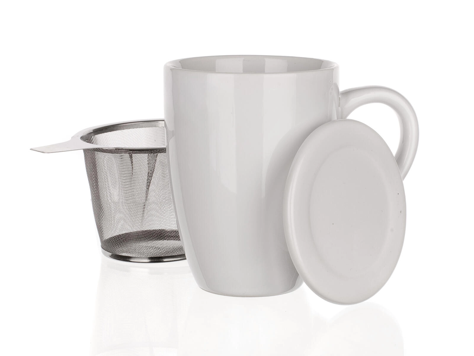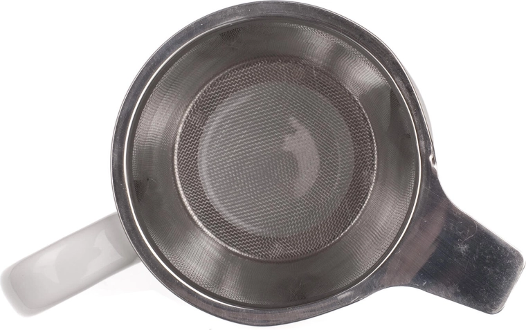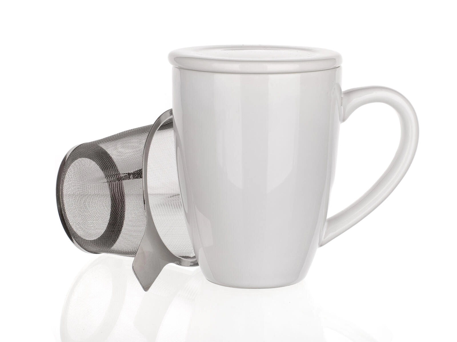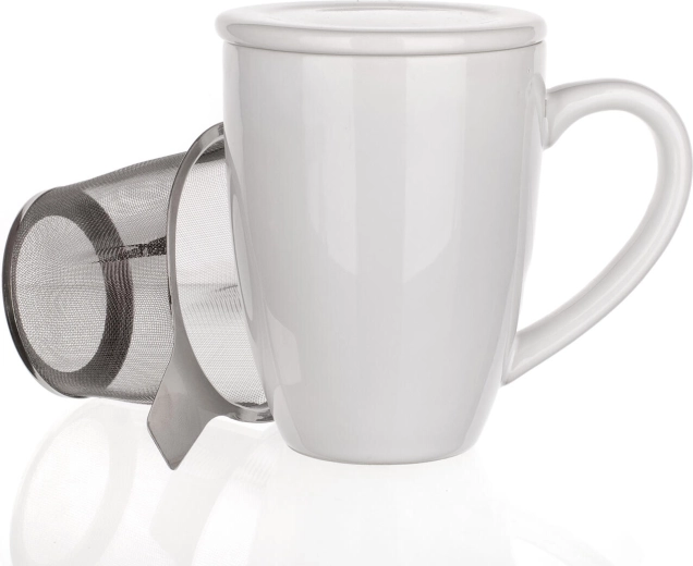 Dette hvide keramiske krus på 350 ml er et fremragende valg for elskere af løs te. Det aftagelige filter i rustfrit stål med fin mesh sikrer en ren infusion uden urenheder, og låget hjælper med at holde drikken varm længere. Efter udtrækning kan låget også bruges som en praktisk afsætningsskål til filteret.