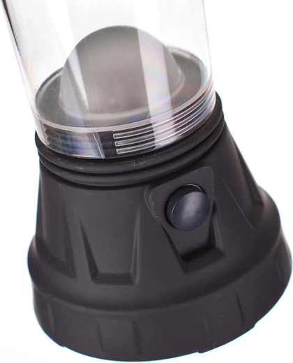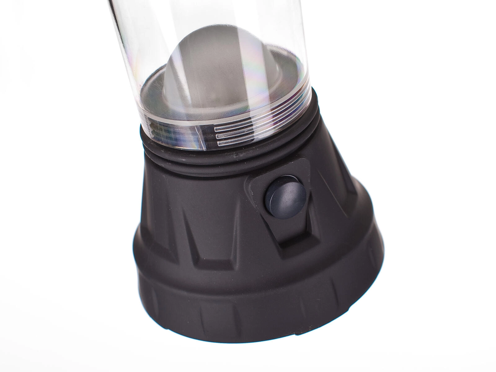 Den gennemsigtige cylindriske diffuser og det øverste håndtag muliggør jævn rumbelysning og nem ophængning i teltet eller på en gren.