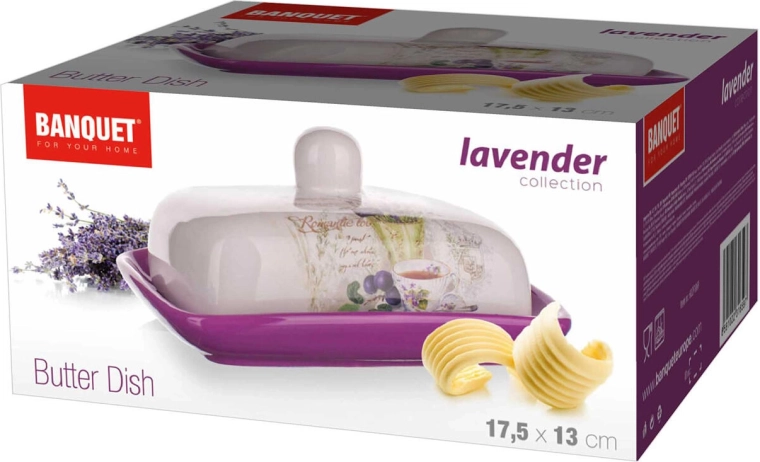 Den elegante keramiske smørboks Lavender er ideel til både hverdagsbrug og festlige lejligheder. Den kvalitetsrige glasur i kombinationen af lilla og hvid beskytter overfladen, gør rengøringen nemmere og fremhæver det romantiske lavendeldekor.