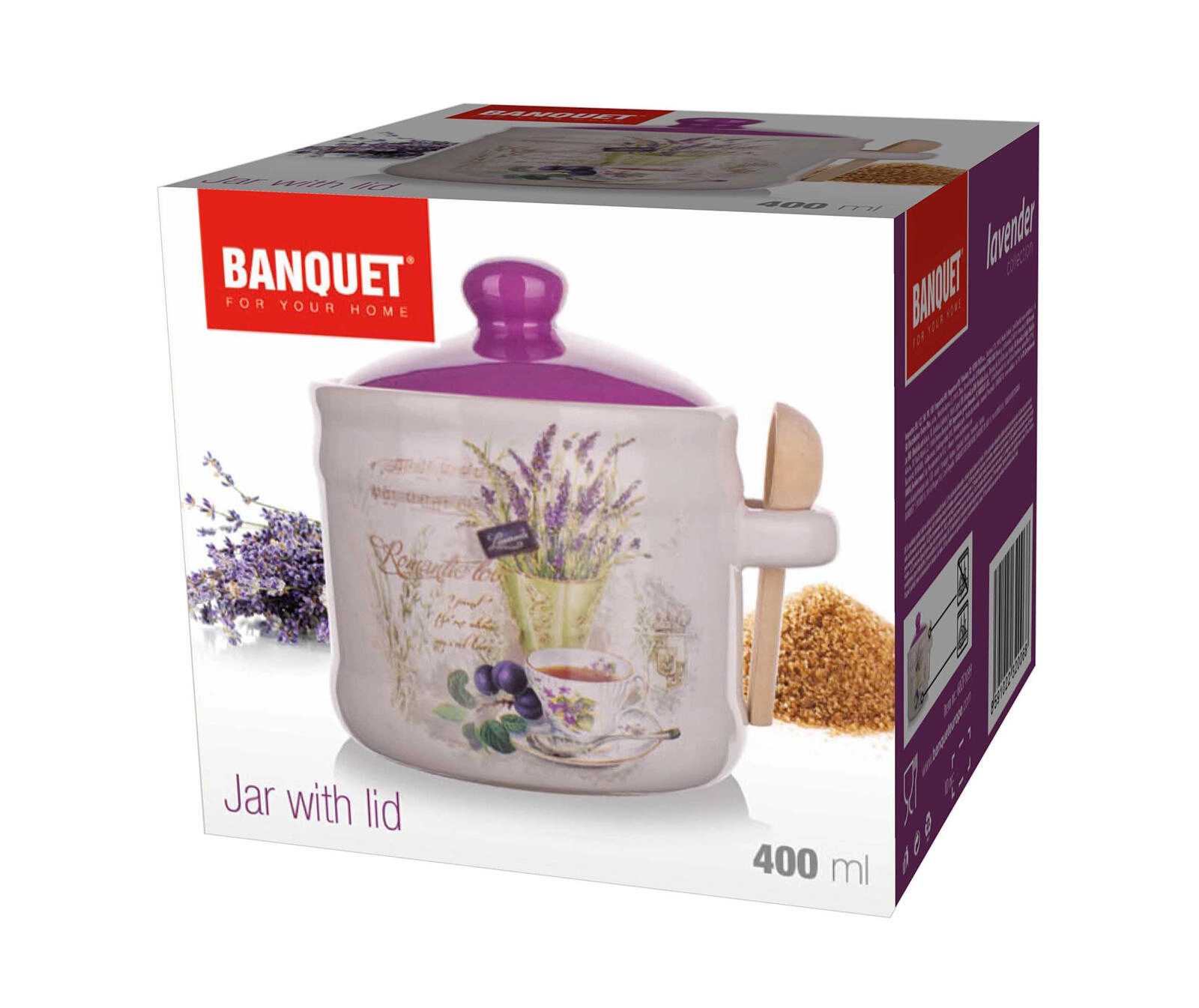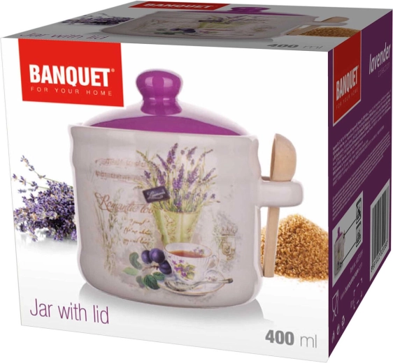 Stilfuld keramisk fødevarekrukke med volumen på 400 ml i LAVENDER-design er ideel til sukker, salt eller urter. Takket være det tætsluttende låg og den medfølgende træske tilbyder den praktisk og æstetisk opbevaring. Keramisk udførelse, praktisk træske og delikat lavendeldekor fuldender dit køkken ned til mindste detalje.