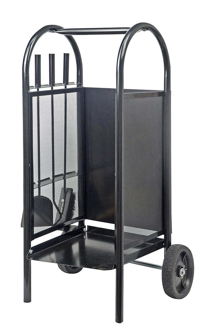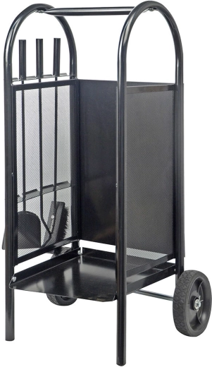 Praktisk brændekurv med vogn og tredelt pejsetilbehør i robust stål til nem transport og opbevaring af brænde ved pejsen. Tilbyder stabil konstruktion, bæreevne op til 80 kg og kompakte mål for let håndtering og vedligeholdelse.