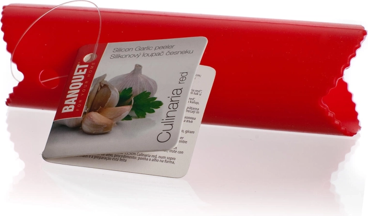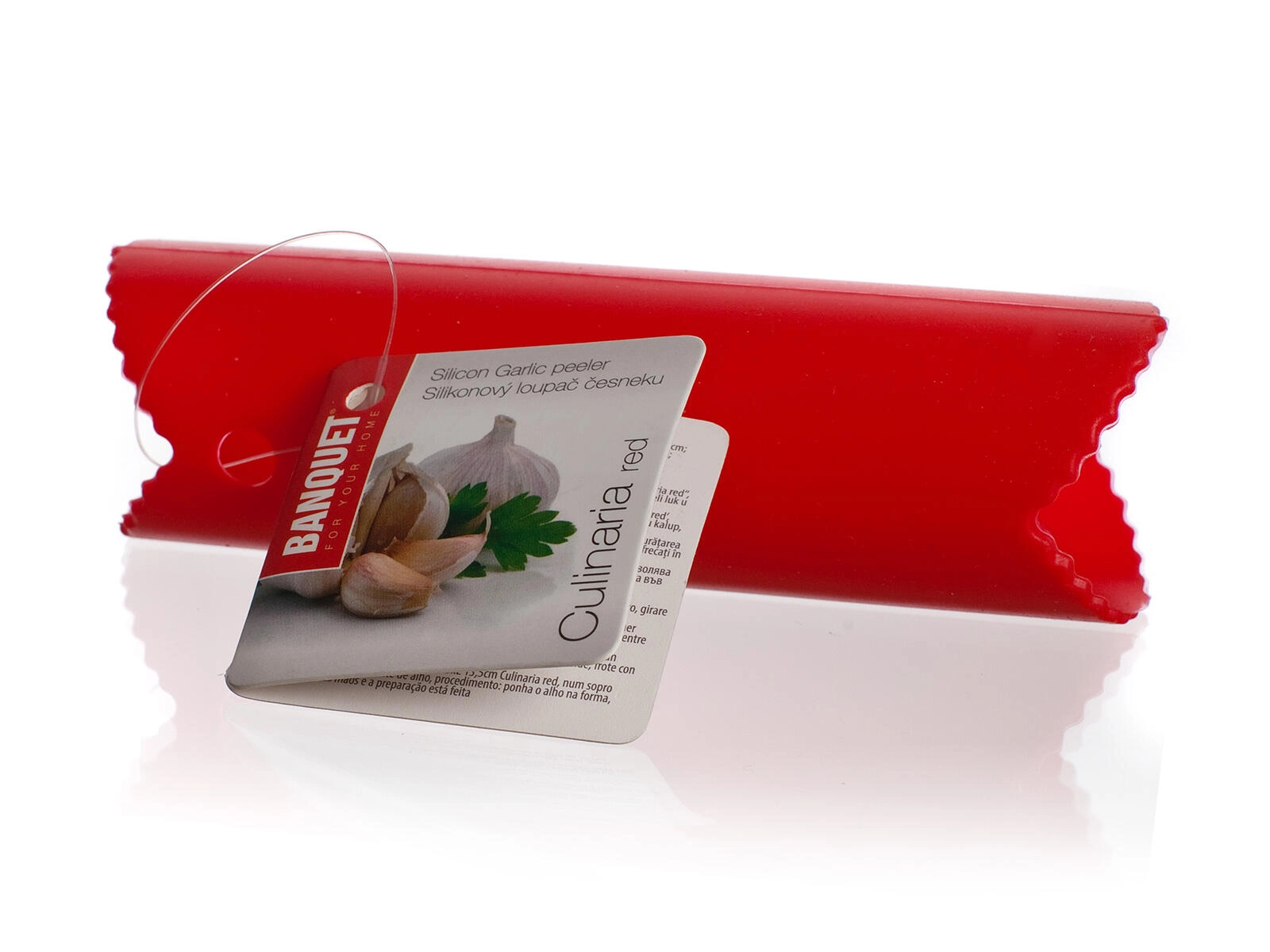 Praktisk silikone-hvidløgsskræller CULINARIA rød med en længde på 13,5 cm og en diameter på 3,5 cm hjælper dig med at skrælle hvidløg på få sekunder. En let rulning er nok, og feddene er klar til videre brug – hurtigt, rent og uden lugt på fingrene.