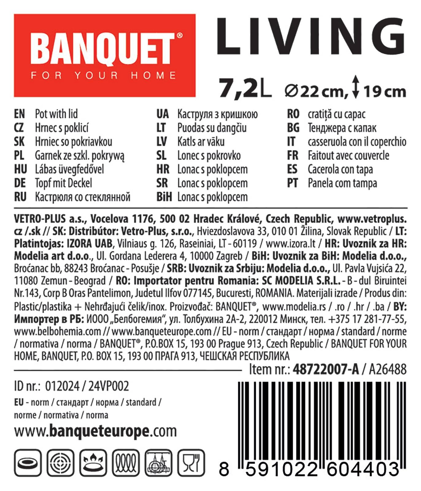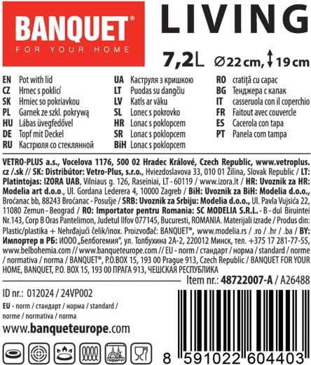 Praktisk rustfri stålkasserolle LIVING med volumen 7,2 l og diameter 22 cm er ideel til kogning af supper, saucer og pasta. Den har et glaslåg med rustfri knop, universal anvendelighed til alle typer kogeplader inkl. induktion og en holdbar udførelse i rustfrit stål med blank overflade og tre matte striber for et elegant udseende.