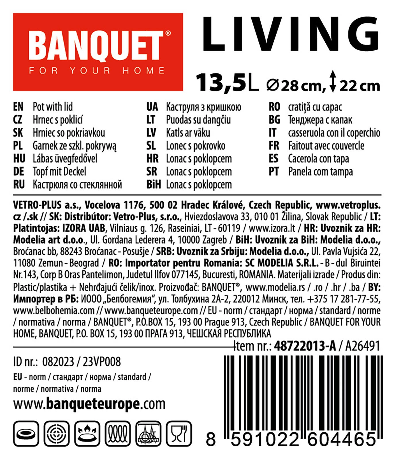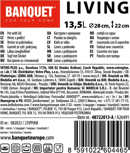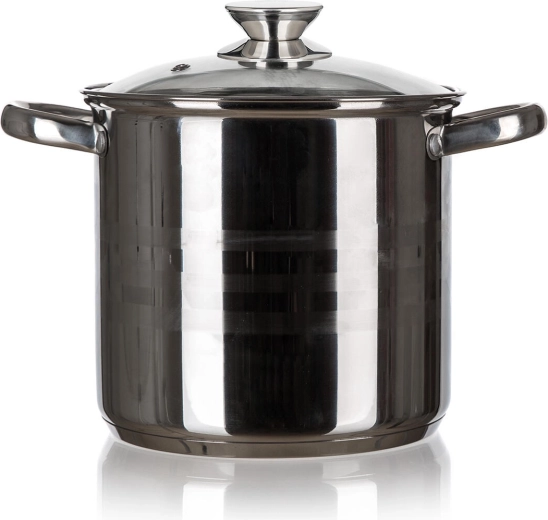Den rummelige LIVING-kasserolle i rustfrit stål på 13,5 l med glaslåg er ideel til at koge supper, fond og større portioner. Den tilbyder en diameter på 28 cm, rustfrit stål 201 af høj kvalitet, glaslåg med knop i rustfrit stål og kompatibilitet med alle typer kogeplader, inklusive induktion.