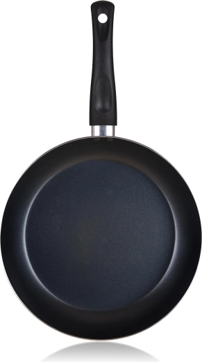 Aluminiumskroppen er let og varmer hurtigt op. Det sorte bakelit-håndtag med nittet fastgørelse sikrer et fast og sikkert greb.