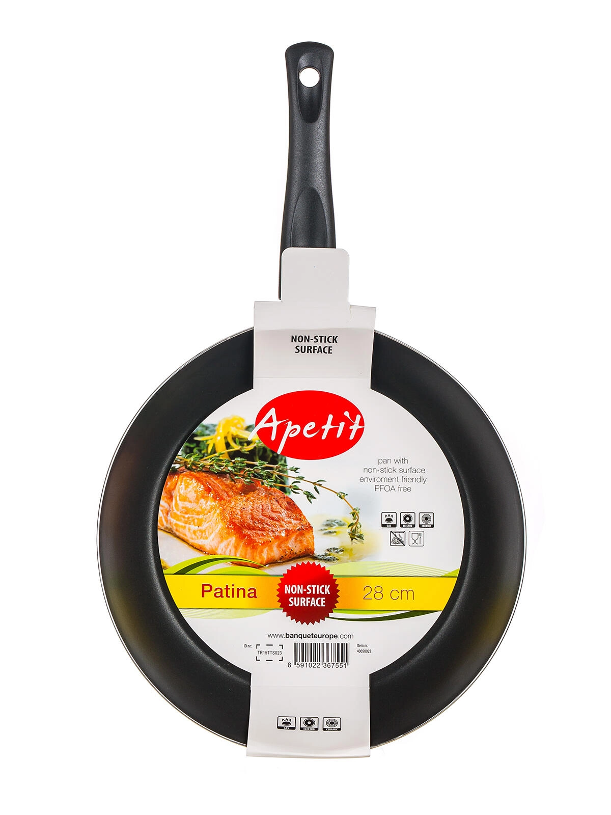PATINA-panden 28 cm kombinerer en let aluminiumskrop for hurtig varmefordeling og en kvalitets nonstick-belægning XYLAN, som gør både madlavning og efterfølgende rengøring nemmere. Det robuste sorte nittede bakelit-håndtag ligger godt i hånden og giver et sikkert greb.