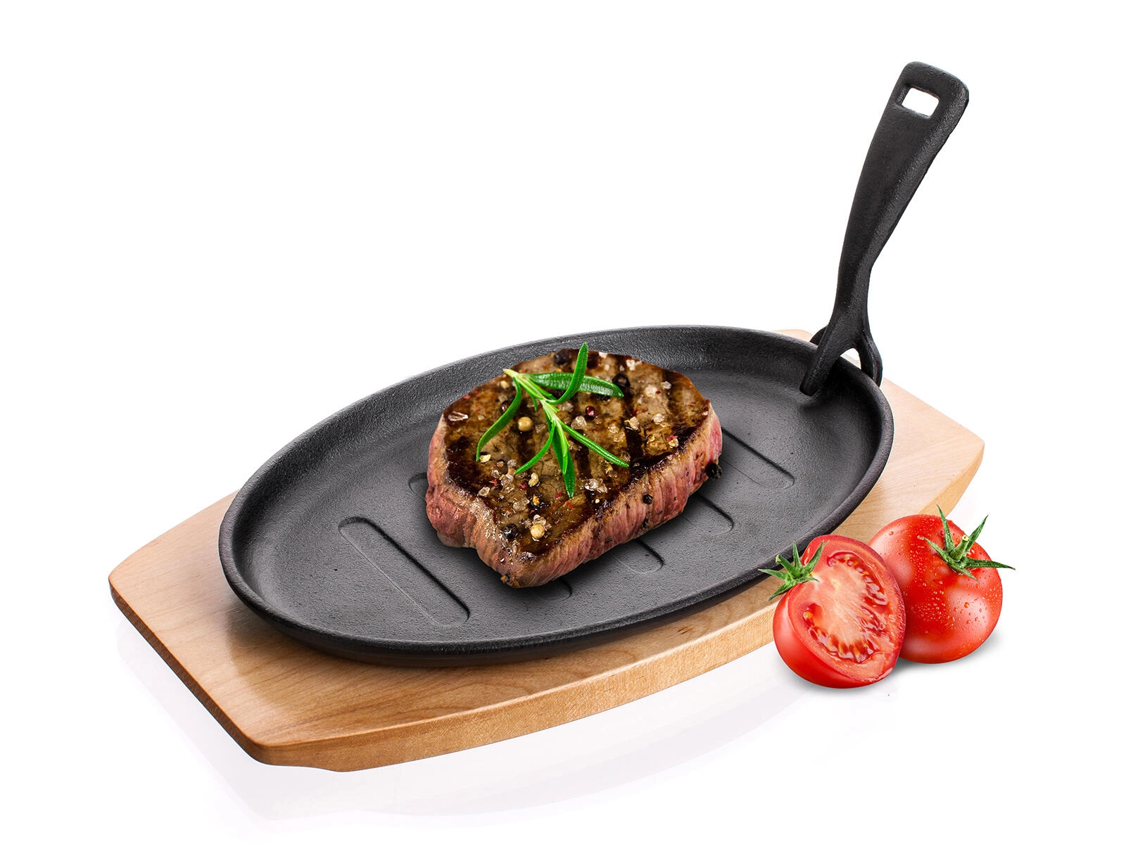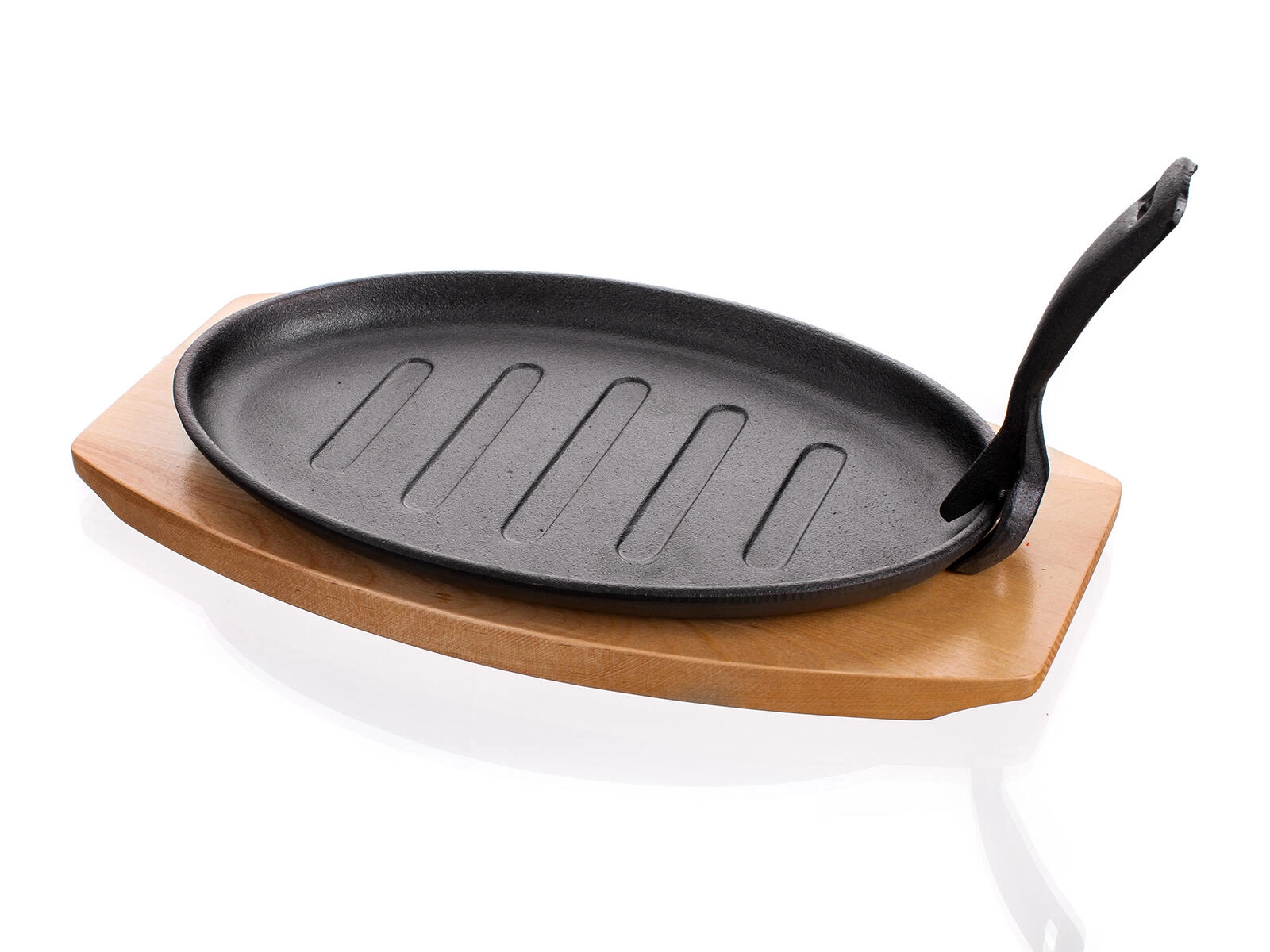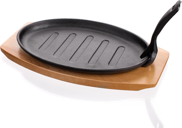 Alsidig støbejernspande med målene 27 × 17,5 cm og et praktisk træbræt, ideel til gratineringsretter i ovn, direkte servering og varmeholdning af retter. Robust støbejern sikrer fremragende varmelagring og jævn varmefordeling, det aftagelige håndtag gør sikker håndtering lettere, og træbrættet fungerer som en stilfuld og sikker underlag til den varme pande.