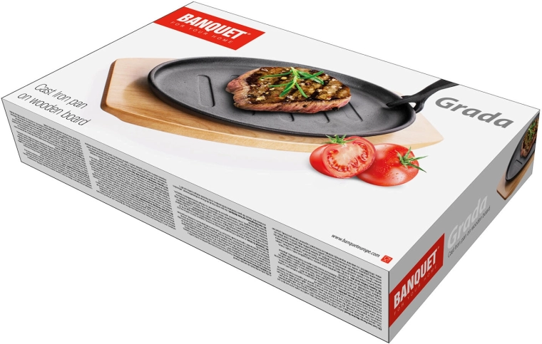 Der medfølger et træbræt, som fungerer som underlag til den varme pande – det beskytter overflader og giver samtidig serveringen et attraktivt udtryk. Takket være de kompakte mål er panden perfekt til gratinering af kød, grøntsager, pasta eller desserter.