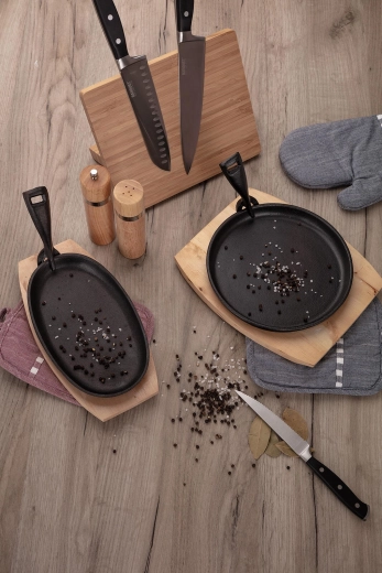 GRADA støbejernspande med en diameter på 22 cm er designet til intensiv daglig brug. Det tunge støbejern holder på varmen og fordeler den jævnt, så du opnår perfekt sprød overflade og saftig kerne. Medfølgende træbræt fungerer som underlag for sikker og stilfuld servering direkte ved bordet.