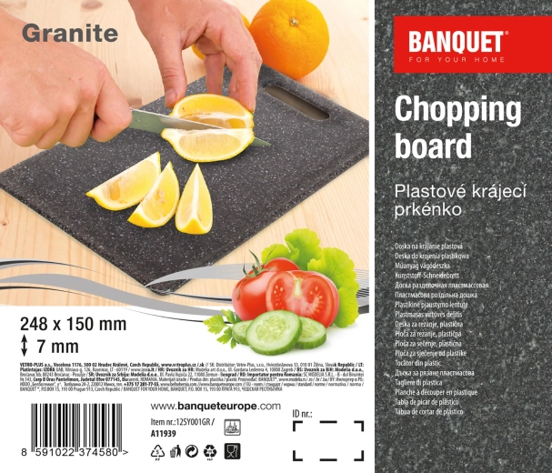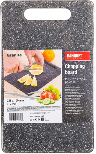 Praktisk plastskærebræt GRANITE i elegant grå farve er det ideelle valg til tilberedning af frugt, grøntsager, kød og bagværk. Let, tyndt og samtidig holdbart – en perfekt hjælper til daglig skæring.
