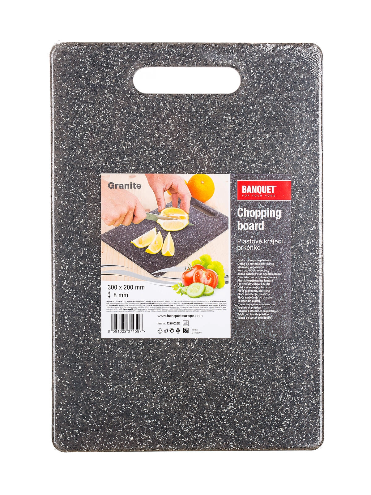 Nyd behagelig skæring på et solidt og let skærebræt med moderne granitlook. Takket være det praktiske hul kan brættet nemt bæres eller hænges op, og den slanke profil sparer plads ved opbevaring.