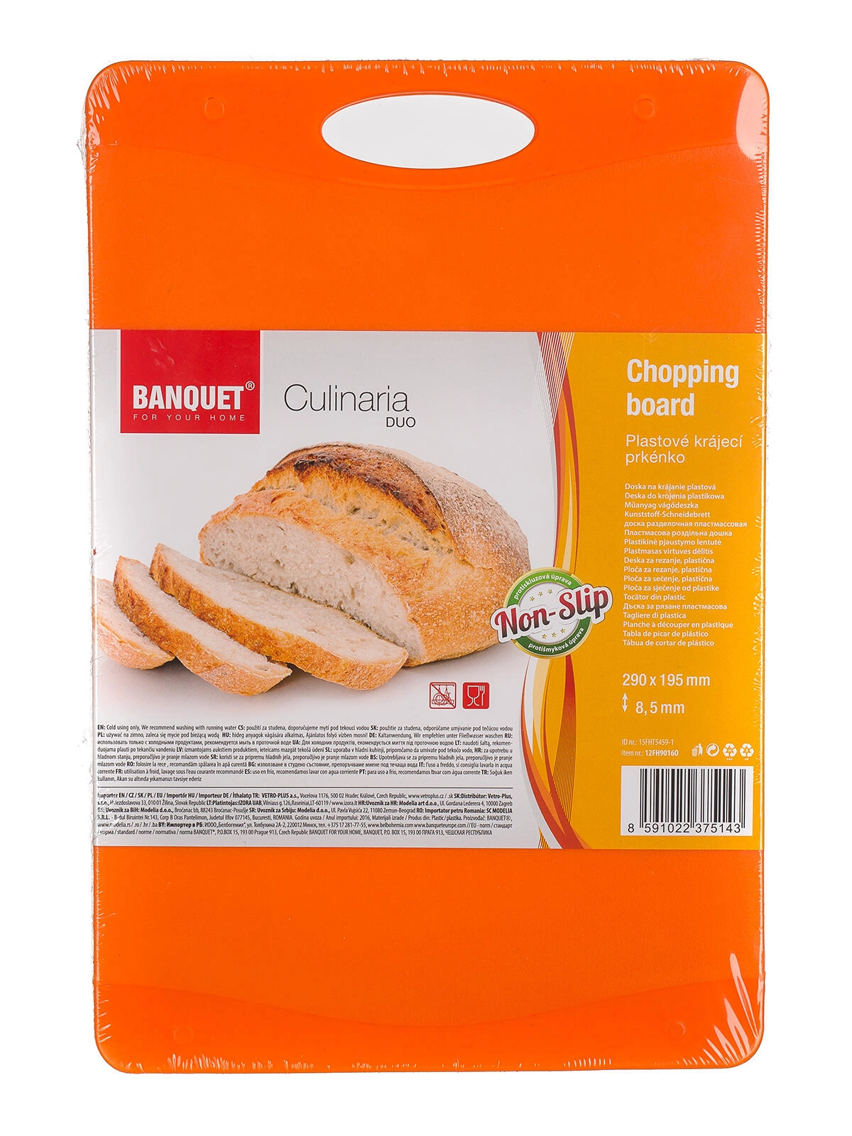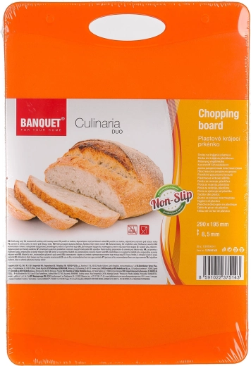 Det vendbare skærebræt Culinaria Duo kombinerer moderne look og funktionalitet. To nuancer af orange frisker dit køkken op, mens skridsikre elementer sikrer stabilitet under skæring. Det integrerede hul gør både transport og ophængning lettere.