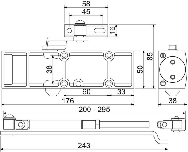 Brugeren vil sætte pris på den justerbare lukkehastighed og sluttryk, som sikrer en stille og sikker drift uden hårde stød. Dørlukkeren muliggør en maksimal åbningsvinkel på 180° og er velegnet til døre med en vægt på 30–65 kg og en bredde op til 950 mm. Montagen er fleksibel – på dørblad eller karm – og giver hurtig idriftsættelse.