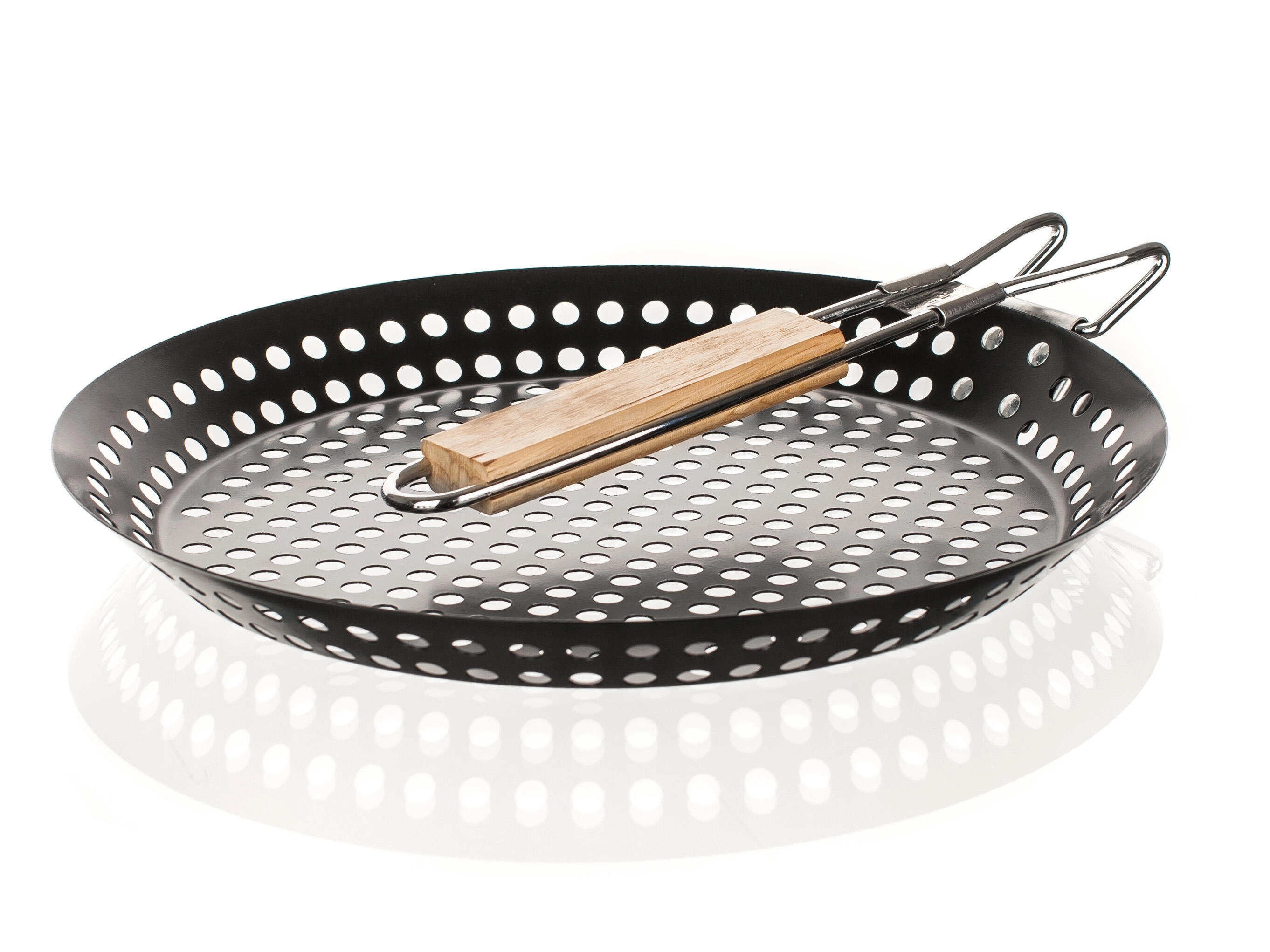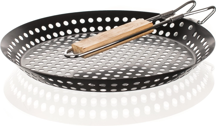 Praktisk grillpande med en diameter på 31 cm i robust stål med nonstick-belægning, ideel til fisk, kød og grøntsager. Takket være den perforerede bund får maden en autentisk grillsmag og falder ikke gennem risten. Det sammenklappelige træhåndtag sikrer nem håndtering og et sikkert greb.