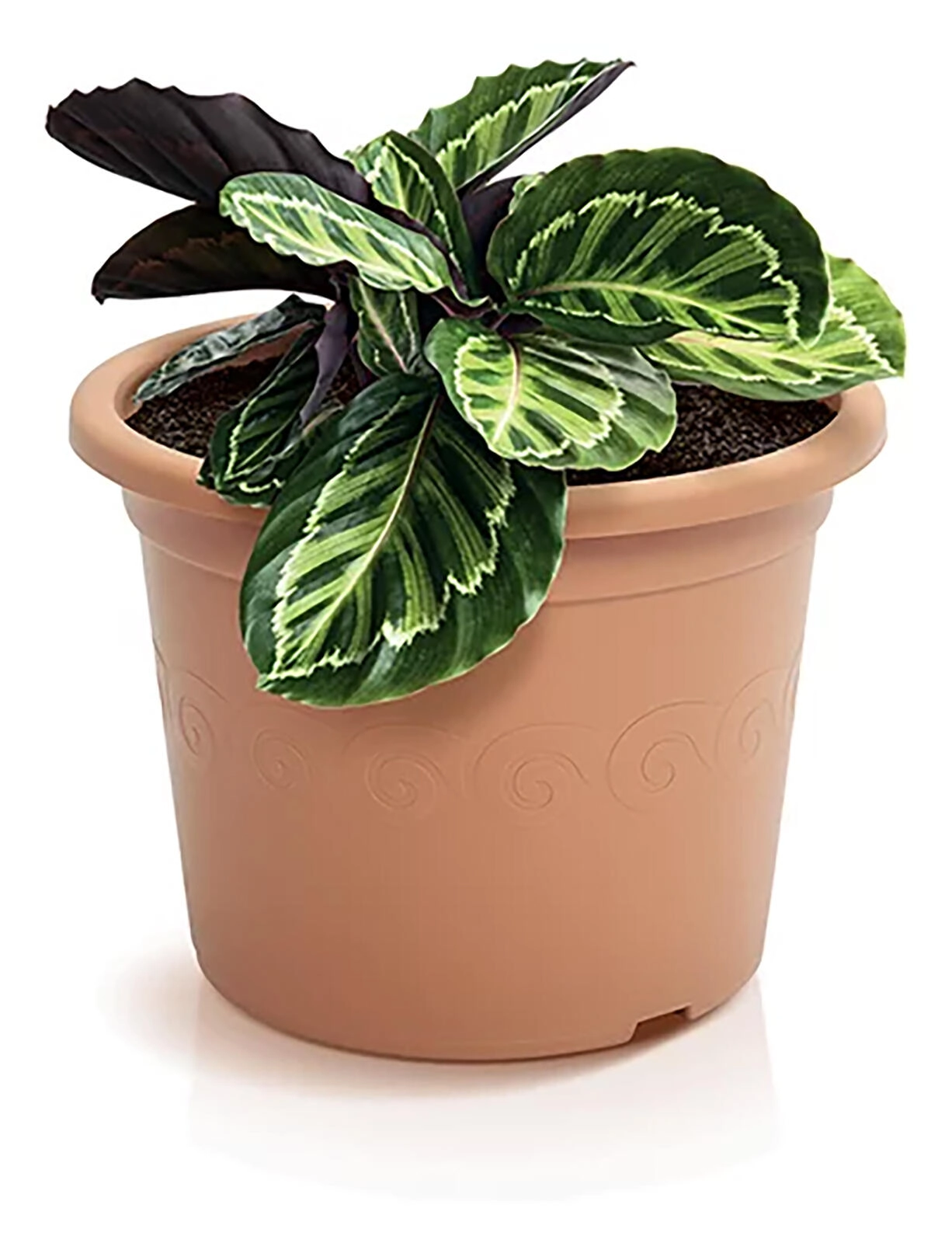 Elegant plastikblomsterkrukke i terrakottafarve med diskret ornamentik, som smukt fuldender både interiør og eksteriør. Den tilbyder lav vægt, vejrbestandighed og praktisk dræn for sund plantevækst.