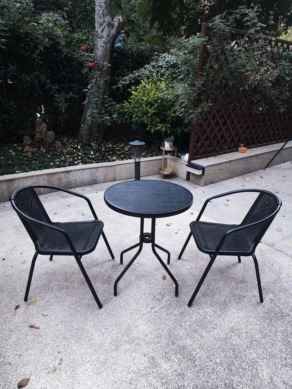 Stilfuldt bistrosæt til to personer til have, altan og terrasse, som kombinerer robust metalkonstruktion, nem vedligeholdelse og vejrbestandighed. Det runde bord med en diameter på 60 cm og to komfortable stole med en bæreevne på 120 kg giver det ideelle sted til morgenkaffen og hyggelige aftener.