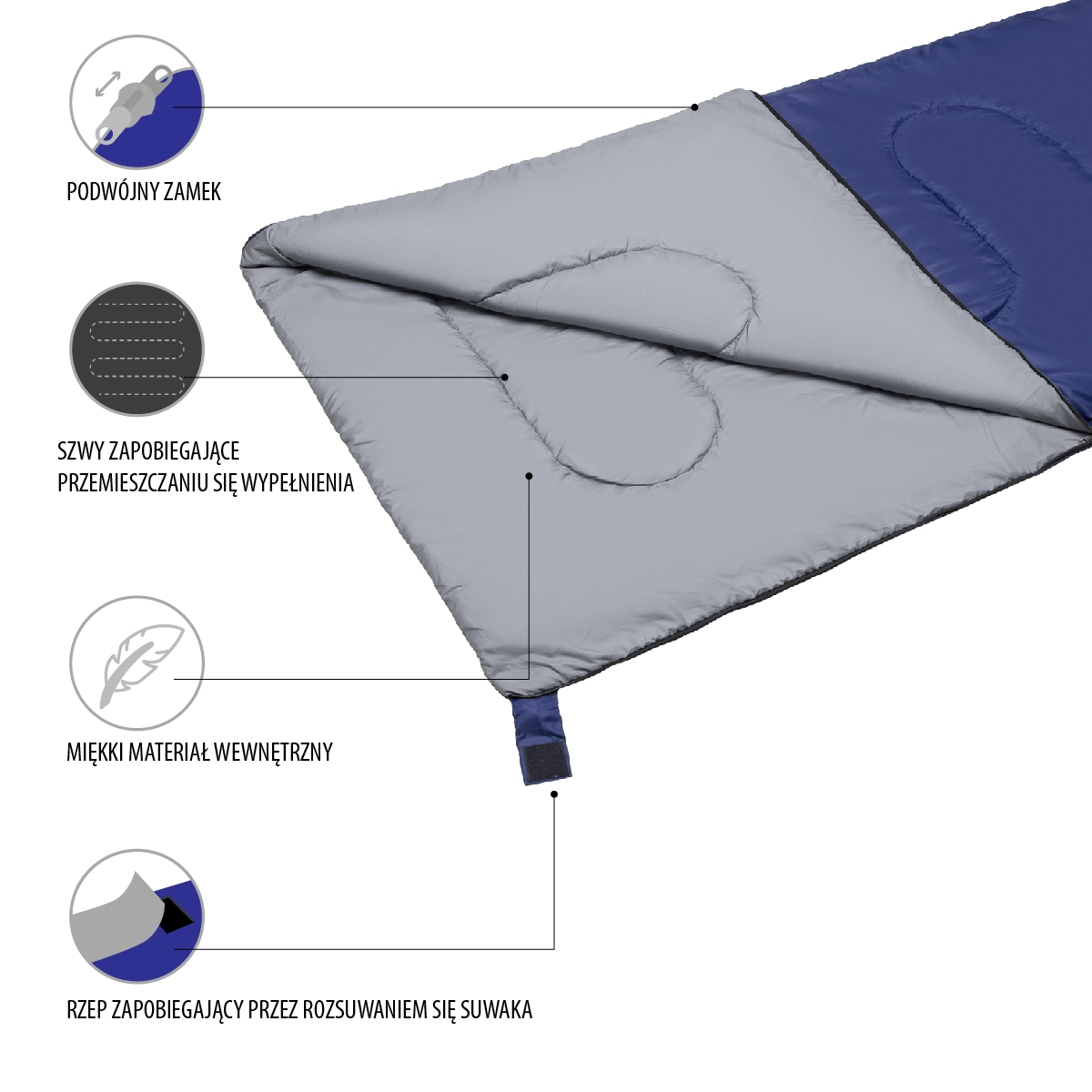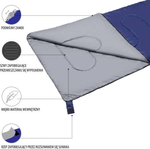 Den praktiske to-vejs lynlås løber langs siden og bunden og er sikret med en bred kant med velcro, som forhindrer, at den åbner sig under søvn. Når den er helt åbnet, kan soveposen bruges som tæppe eller plaid. To identiske modeller kan nemt lynnes sammen til én dobbeltsovepose. Medfølgende er en kompakt pose med snøre for komfortabel bæring over skulderen.
