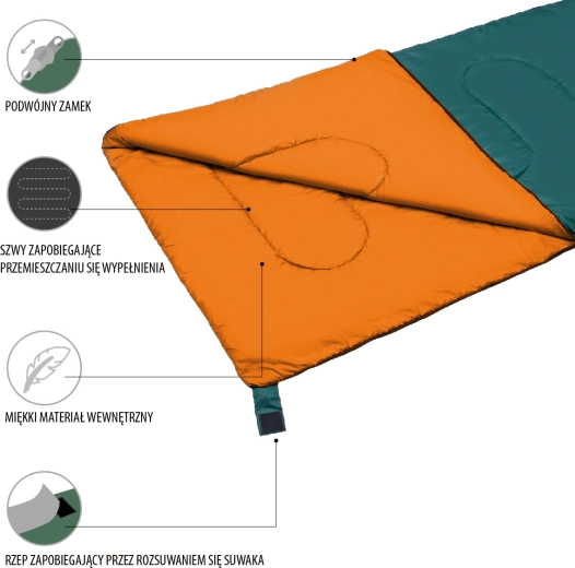 Tovejslynlåsen løber i siden og langs underkanten og gør, når den lynes helt op, soveposen til et rummeligt tæppe. En bred flap med velcro forhindrer, at lynlåsen åbner sig utilsigtet, når du vender dig i søvne. To identiske modeller kan nemt sammenkobles til én sovepose for to personer. Den kompakte transportpose med snor gør det nemt at bære over skulderen.