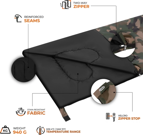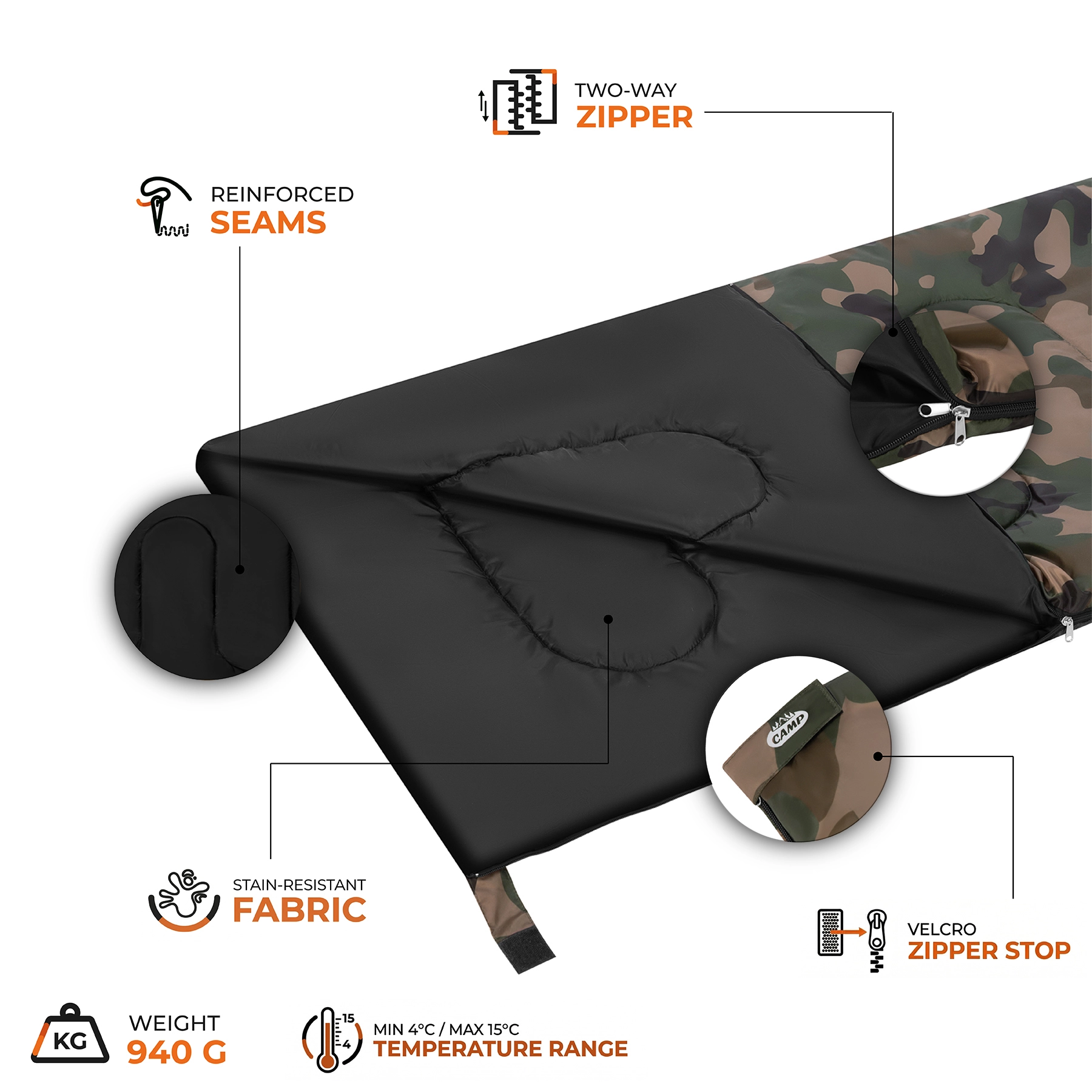 Lynlåsen, der løber langs siden og undersiden, gør det muligt at folde soveposen helt ud til et rummeligt tæppe eller en plaid – ideel til teltet og picnic.