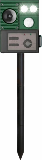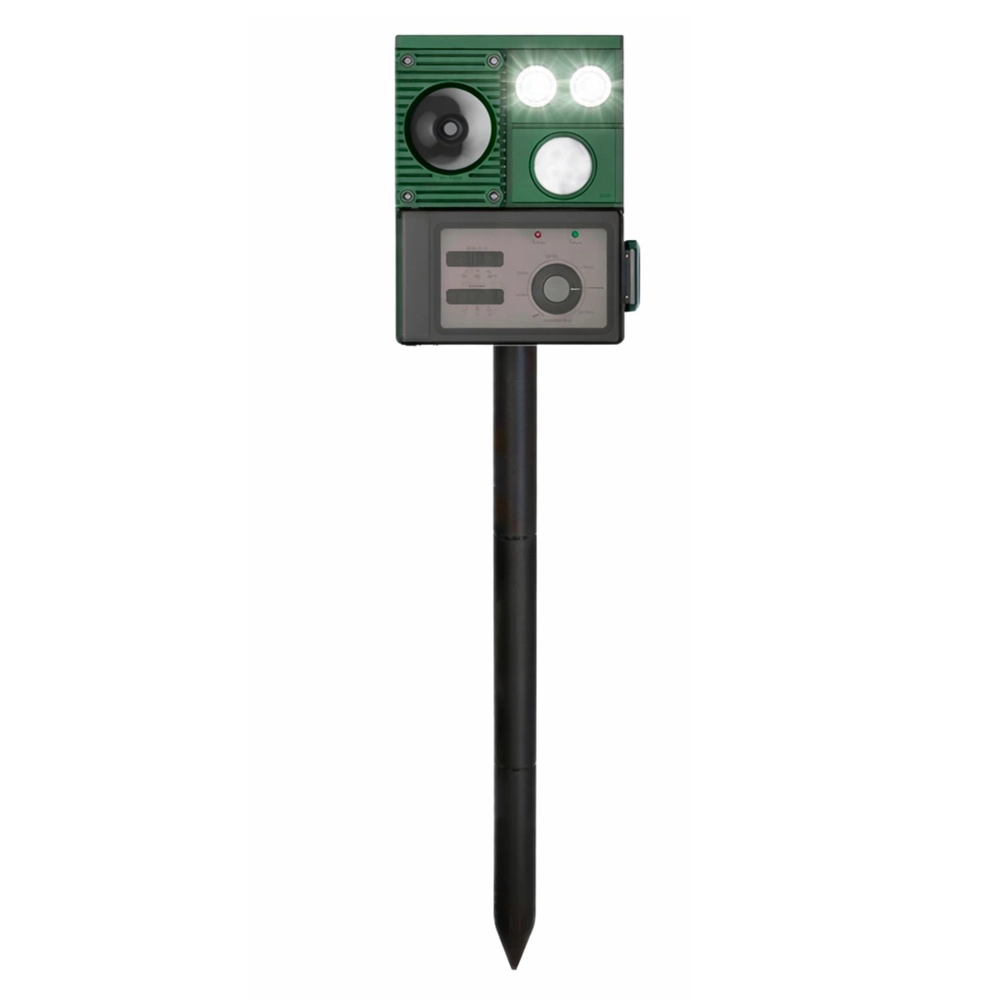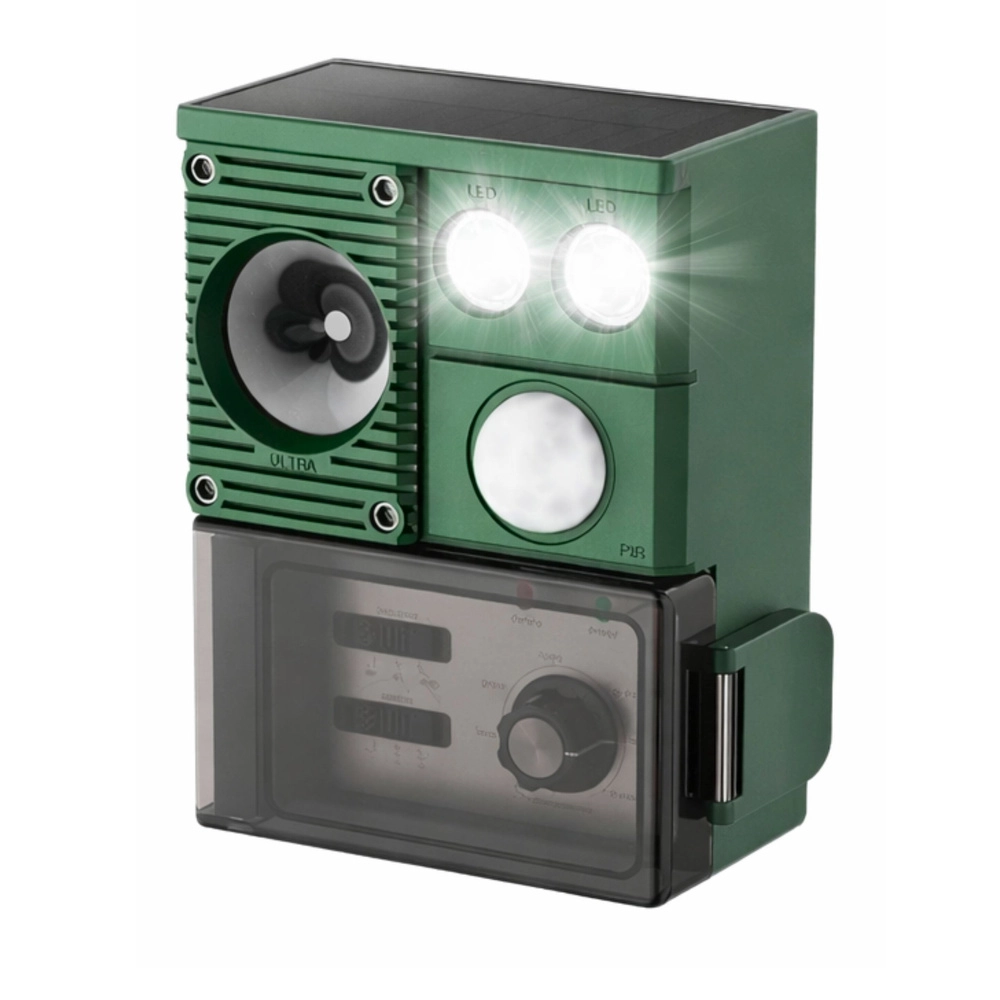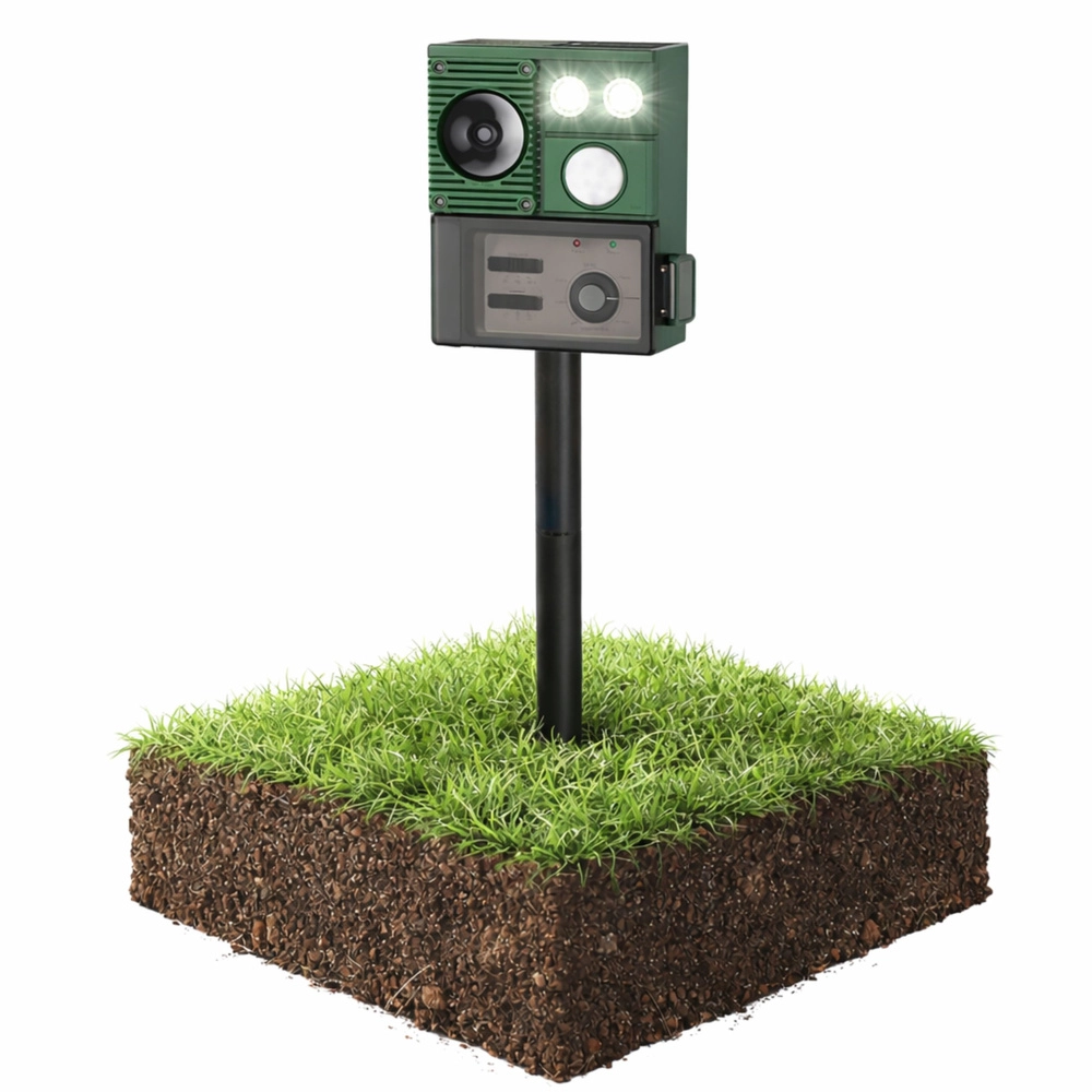 Den moderne solcelledrevne dyreafskrækkelse er en praktisk løsning til at beskytte græsplæner, bede og afgrøder mod uønskede besøgende. Enheden bruger en kombination af ultralyd, lydsignaler og en PIR-sensor, der kun aktiverer afskrækkelsen ved registreret bevægelse. LED-lys forstærker effekten især efter mørkets frembrud.