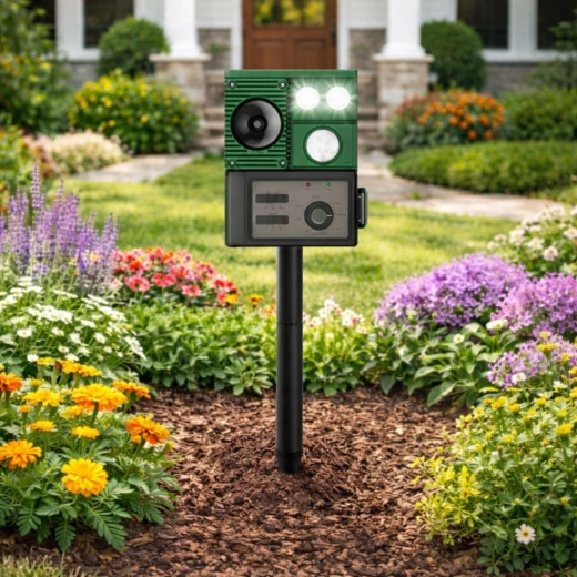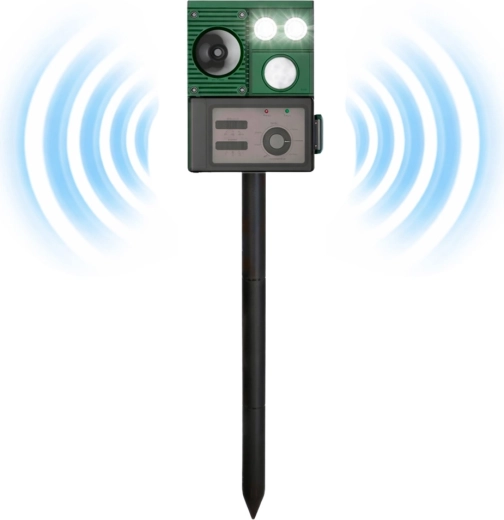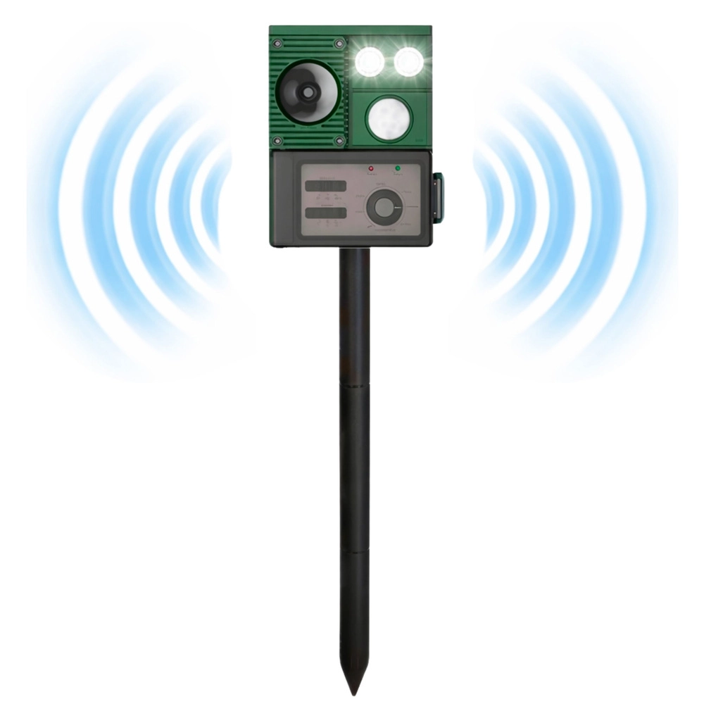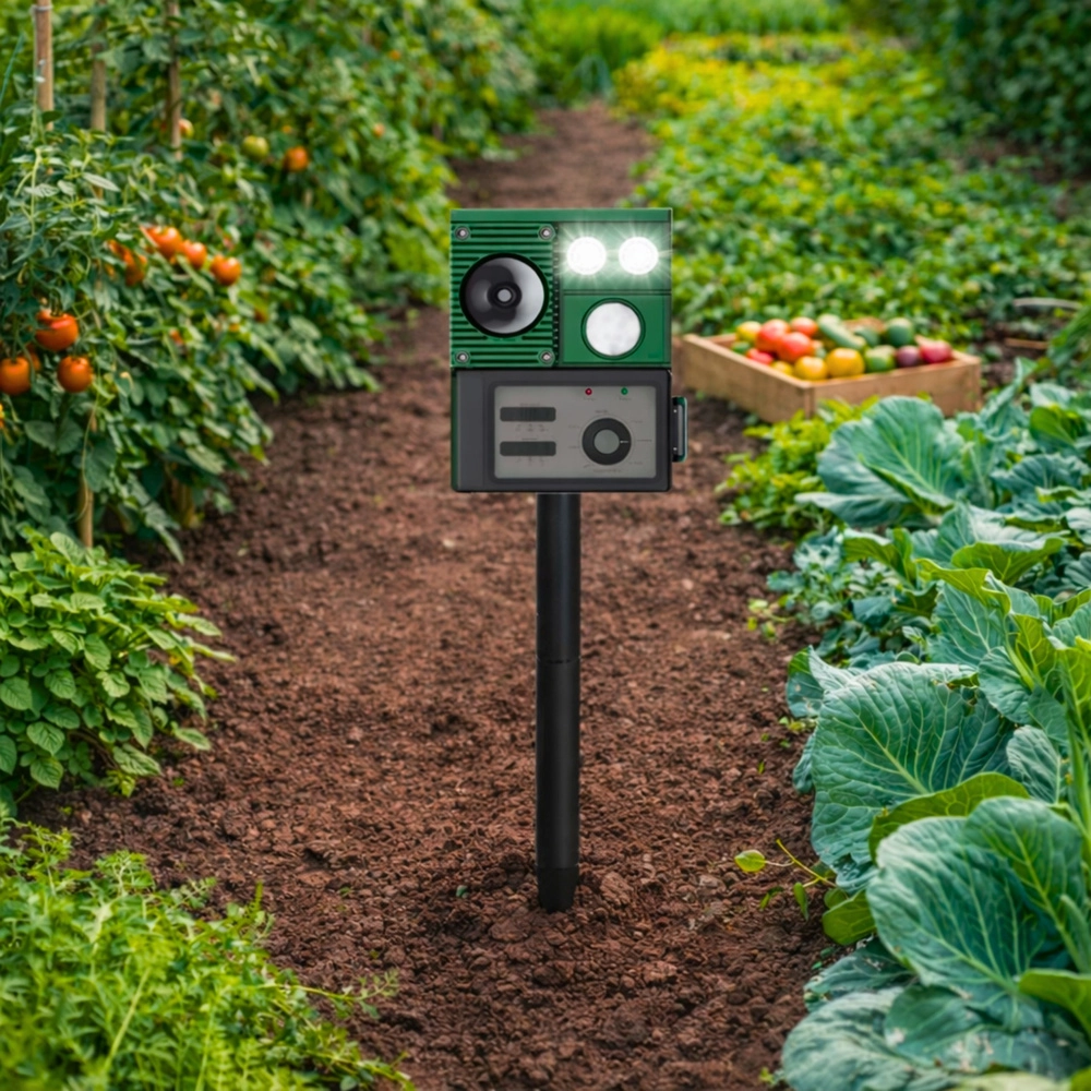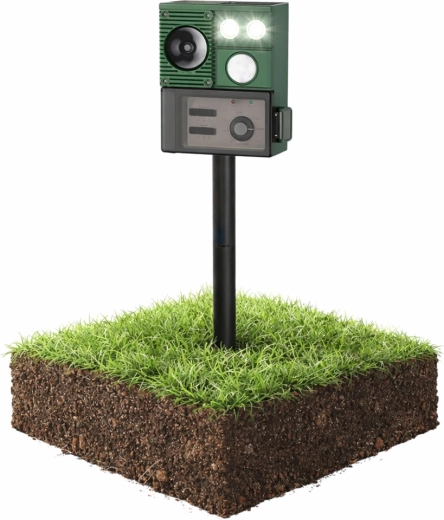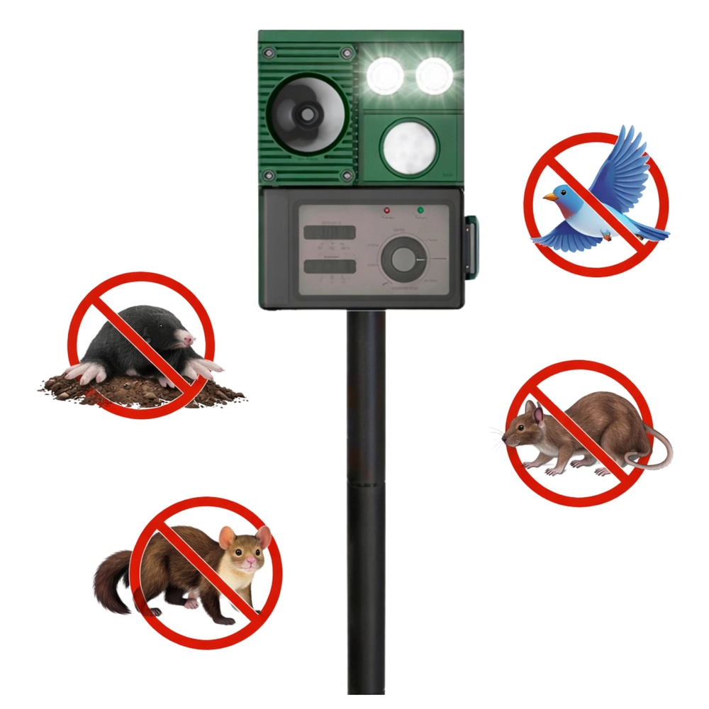 Den moderne solcelledrevne dyreafskrækkelse er en praktisk løsning til at beskytte græsplæner, bede og afgrøder mod uønskede besøgende. Enheden bruger en kombination af ultralyd, lydsignaler og en PIR-sensor, der kun aktiverer afskrækkelsen ved registreret bevægelse. LED-lys forstærker effekten især efter mørkets frembrud.