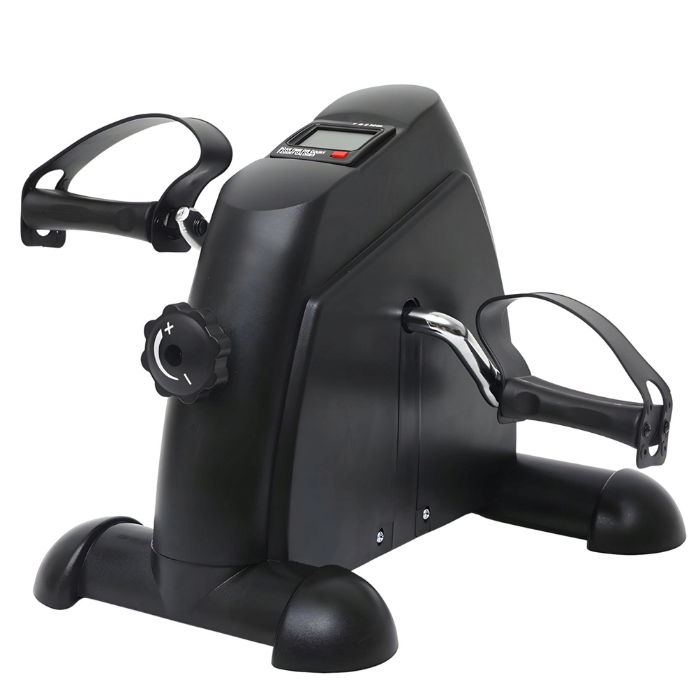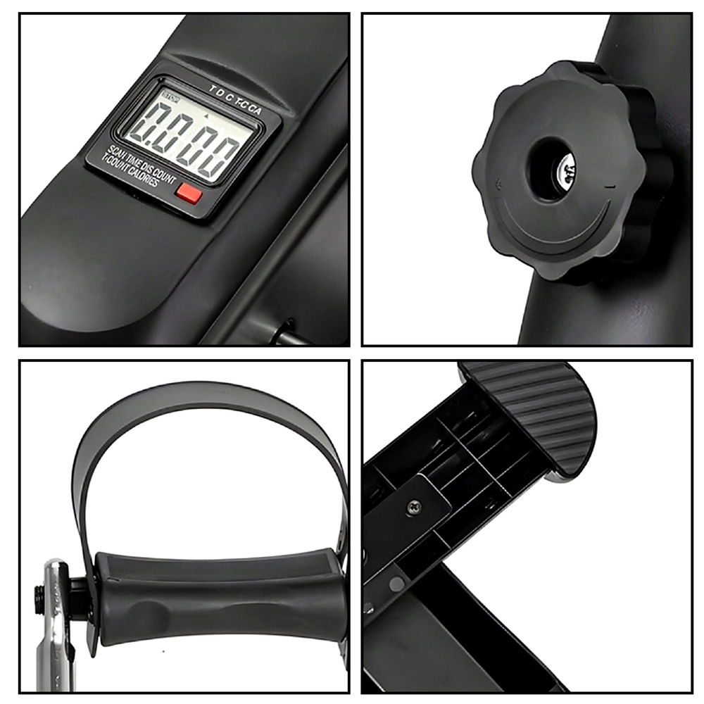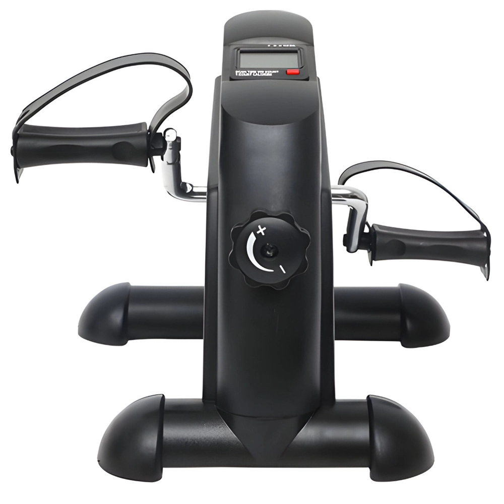 Det integrerede LCD-display viser nøgledata – tid (TIME), kalorier (CAL), antal omdrejninger (CNT), omdrejninger pr. minut (RPM) og SCAN-funktion. En solid og bred base, skridsikre fødder og justerbare remme på pedalerne giver sikkerhed ved pedalløb på gulvet og ved håndtræning på bordet.