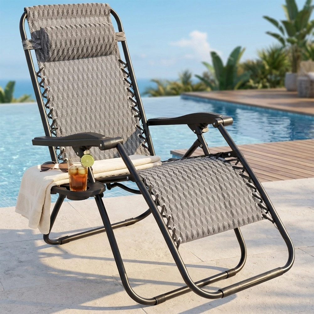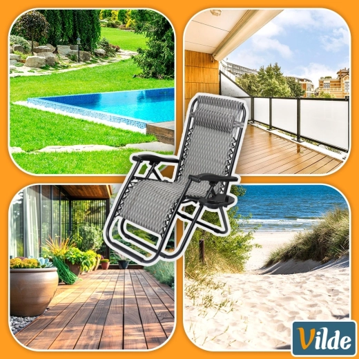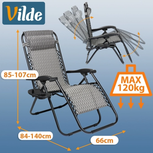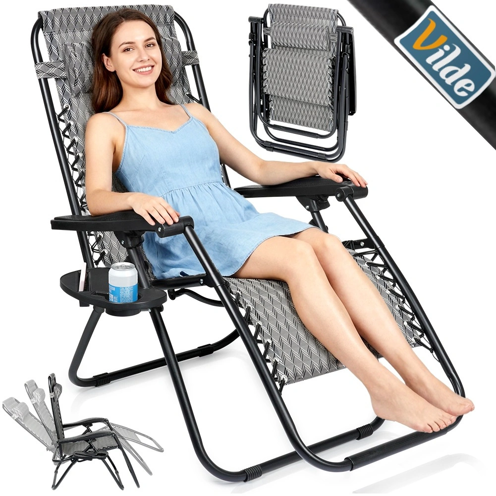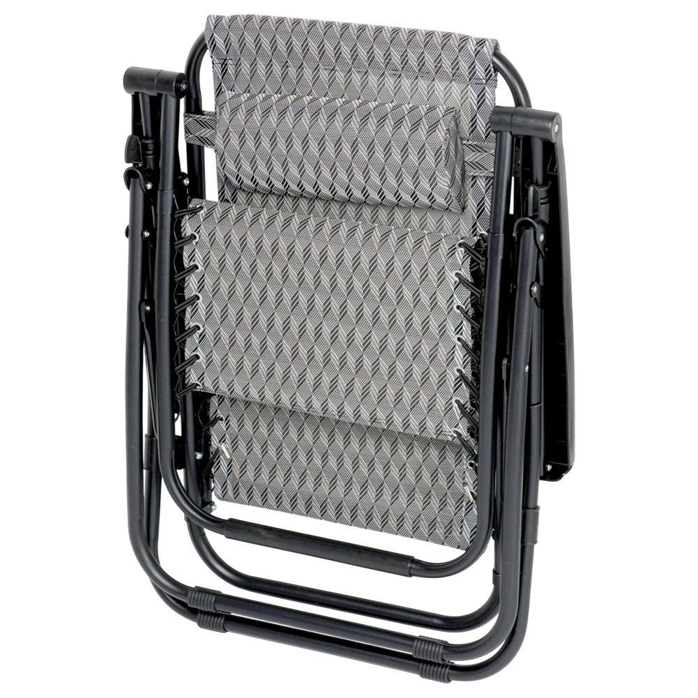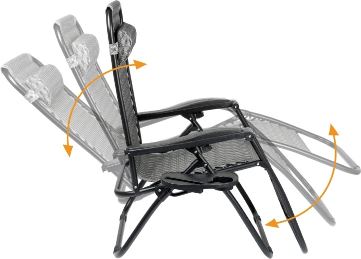 Gravitationsindstilling gør det nemt at skifte kropsposition for maksimal komfort ved læsning, solbadning og afslapning. Den stabile metalkonstruktion med en belastning på op til 120 kg og det stærke betræk af polyestervæv i grå med geometrisk mønster sikrer lang holdbarhed også udendørs.