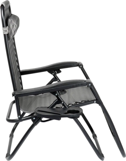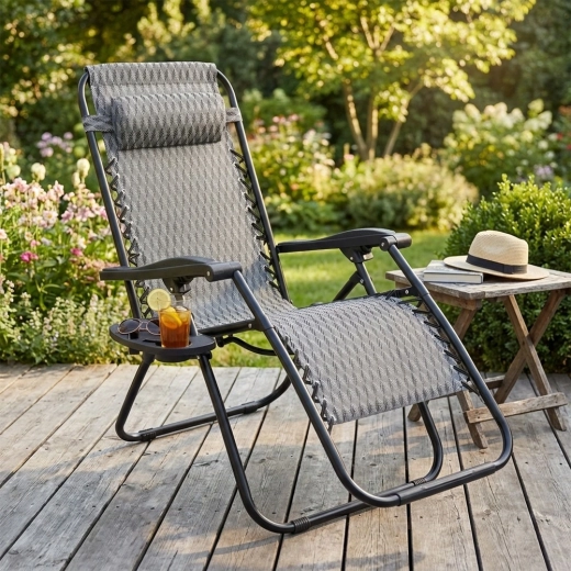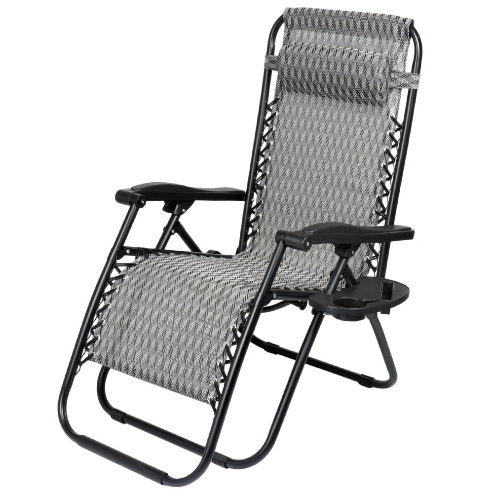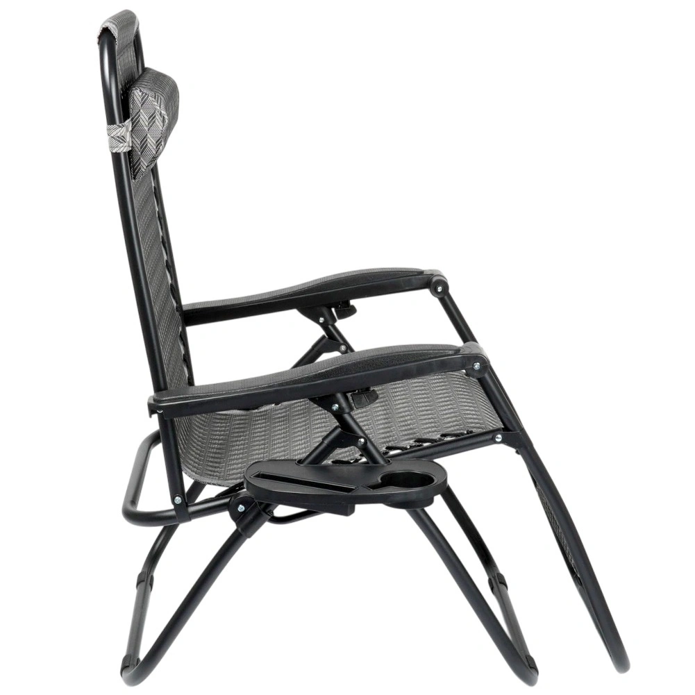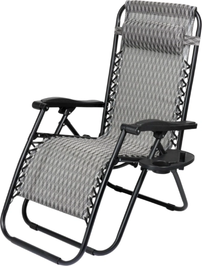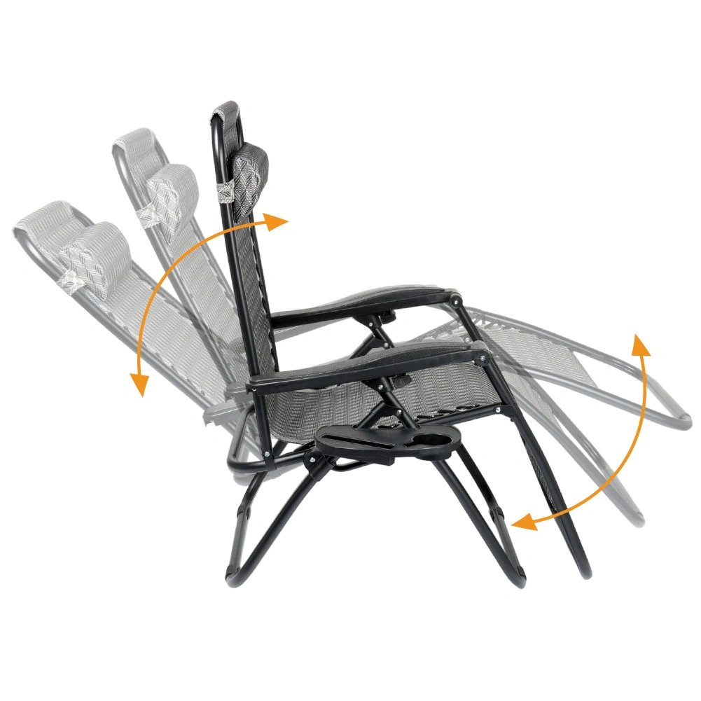 Nyd den perfekte afslapning på en behagelig gravitationsliggestol med trinløs positionsregulering. Takket være den ergonomiske konstruktion tilpasser liggestolen sig kroppen, aflaster ryg og rygsøjle og tilbyder positionerne sidde, halvliggende og liggende. Den holdbare metalramme, åndbare grå tekstil med mønster, aftagelig nakkepude og sidebord med kopholder gør liggestolen til det ideelle valg til have, terrasse, altan og camping.