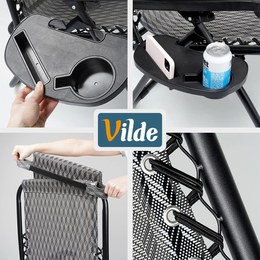 Medfølger gør en blød, aftagelig nakkepude til støtte for nakken samt et praktisk sidebord med holder til drik og telefon, så du har alt ved hånden. Liggestolen klappes hurtigt sammen til kompakte mål og er derfor ideel til have, terrasse, altan, strand og camping.