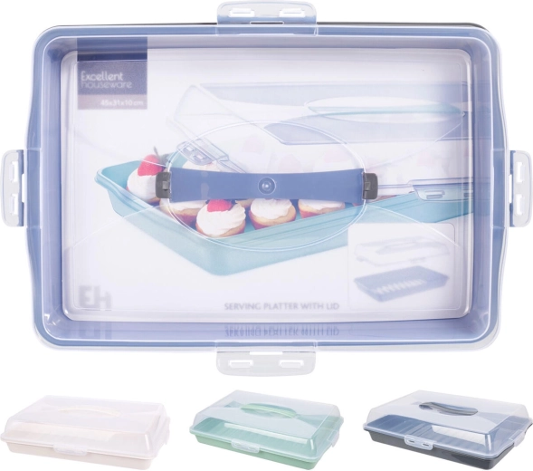 Opbevar og server dine favoritter stilfuldt og hygiejnisk. Denne bakke med praktisk låg er ideel til kager, sandwich, desserter og salte snacks. Let og slidstærkt materiale gør håndteringen nem, og låget forhindrer effektivt støv og insekter i at komme til.