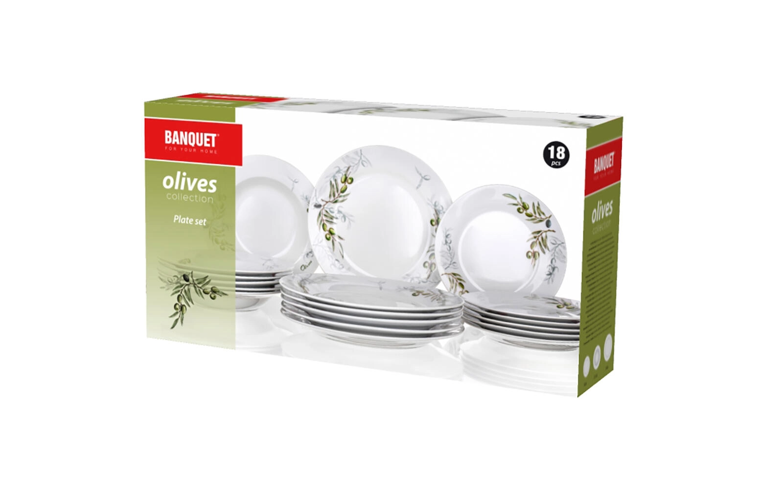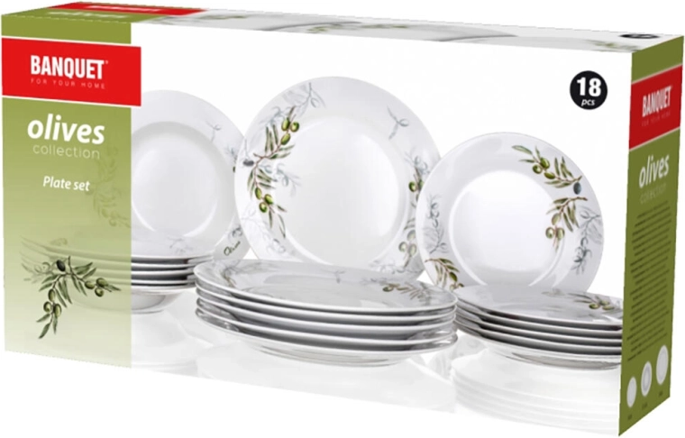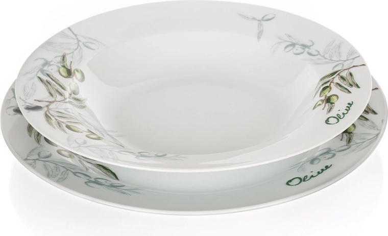 Elegant 18-delt porcelænsstel med olivengmotiv, der giver dit bord et middelhavspræg. Sættet indeholder tallerkener til både hverdag og fest, er egnet til mikrobølgeovn og kan vaskes i opvaskemaskine for nem vedligeholdelse.