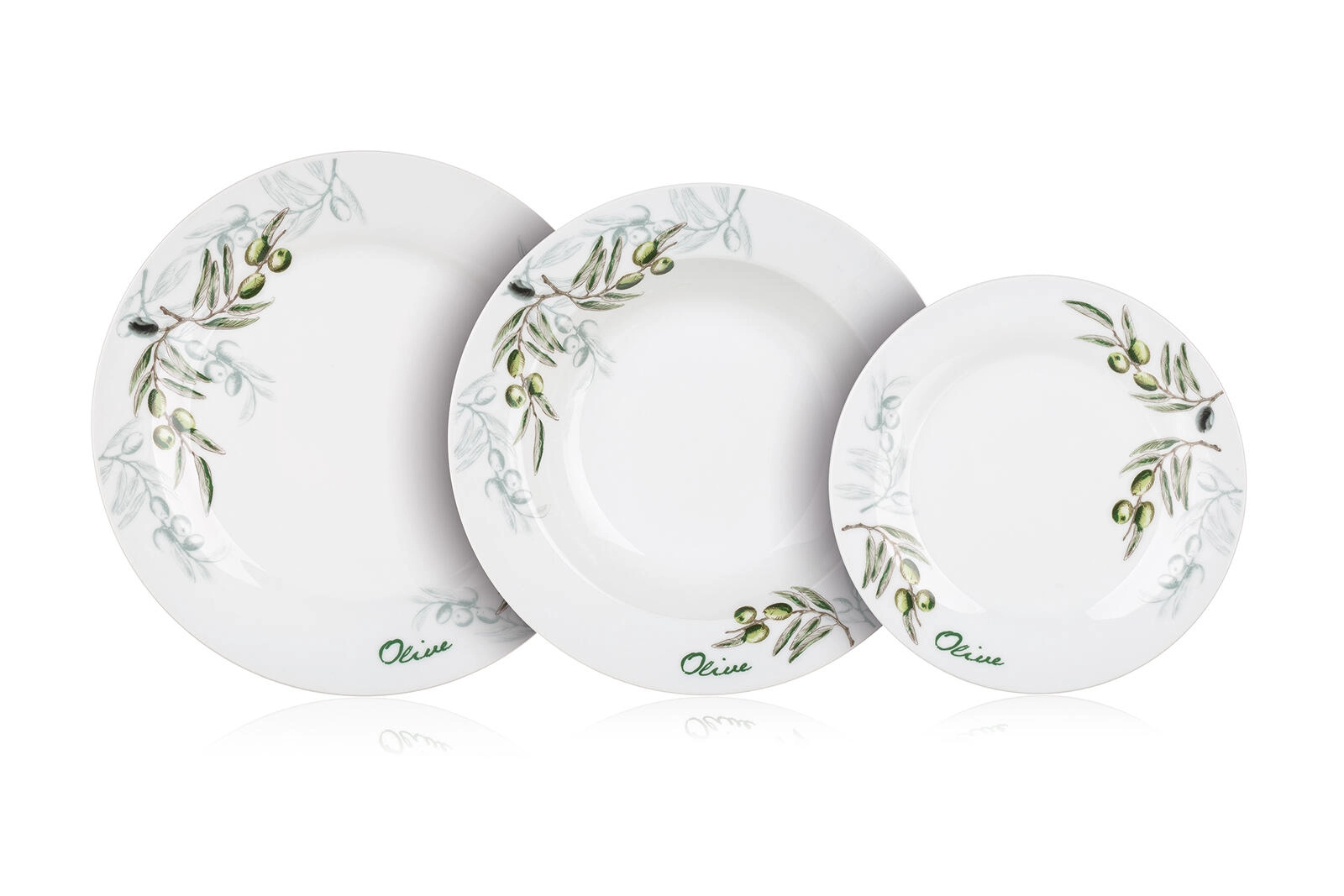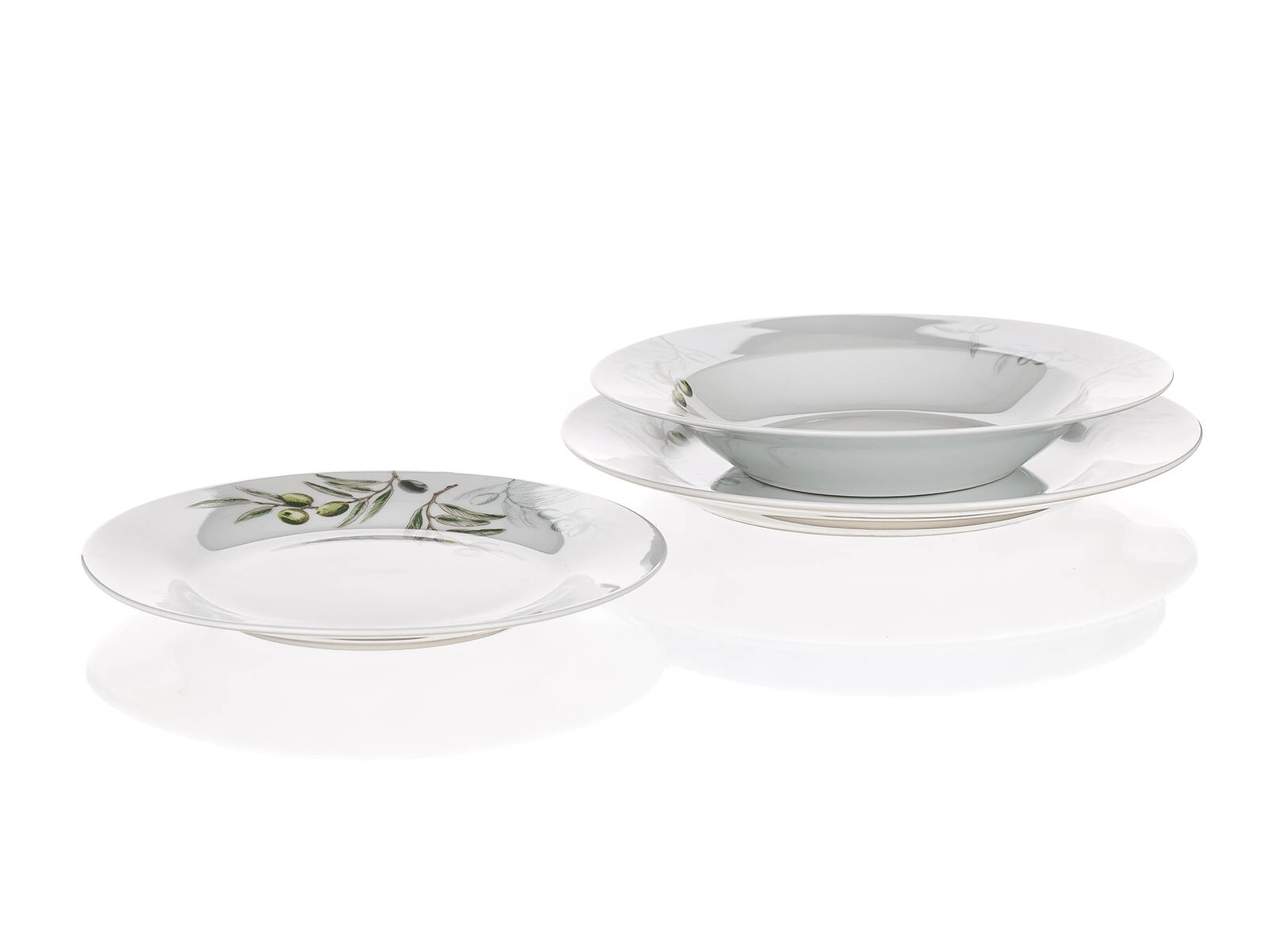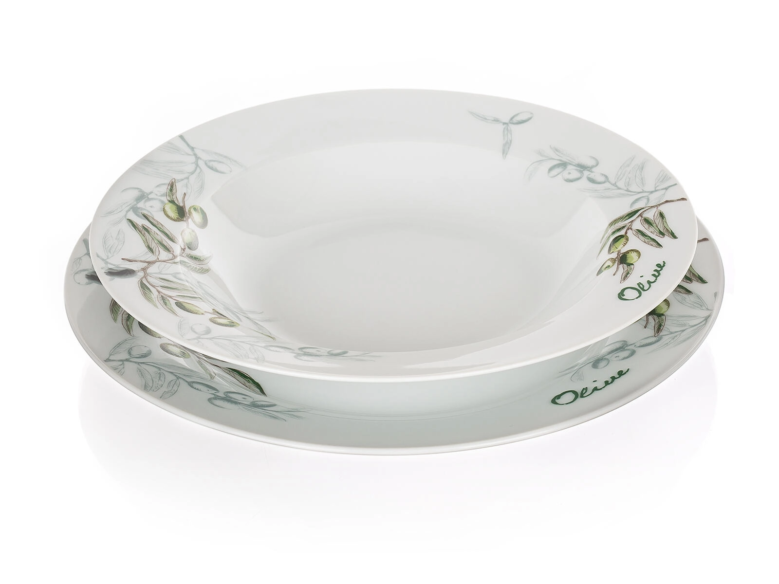 Det diskrete olivenmotiv i grøn-grå nuancer lyser ethvert bord op og er let at kombinere med andet service og dekorationer.