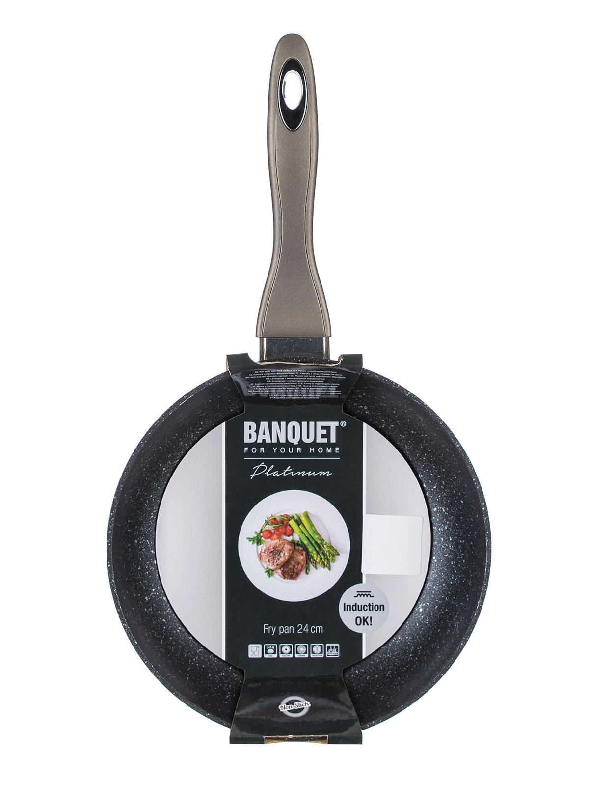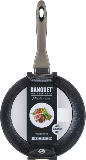 Panden BANQUET Metallic Platinum (24 cm) er fremstillet af støbt, smedet aluminium, som udmærker sig ved høj varmeledningsevne og modstandsdygtighed over for stød og deformation. Den særlige non-stick, hårde og ridsefaste belægning gør det muligt at lave mad med et minimum af fedt og sikrer let frigivelse af maden. Den ydre carbon-metalliske coating giver et moderne udseende og høj holdbarhed.