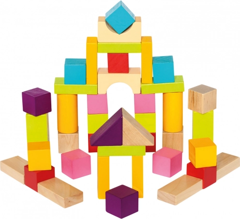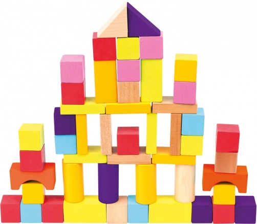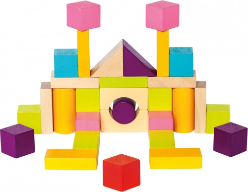 Takket være de mange forskellige former – klodser, cylindre, buer og trekanter – bygger børn tårne, huse og fantasifulde konstruktioner. Glat, kvalitetsforarbejdet træ og livlige farver understøtter sanseudvikling og kreativ leg.