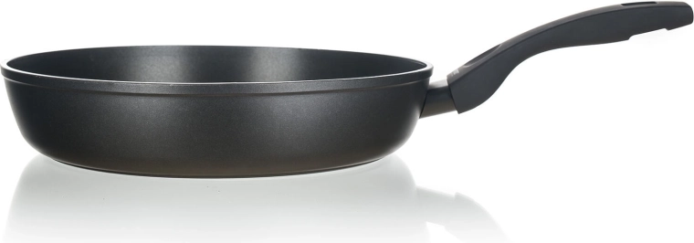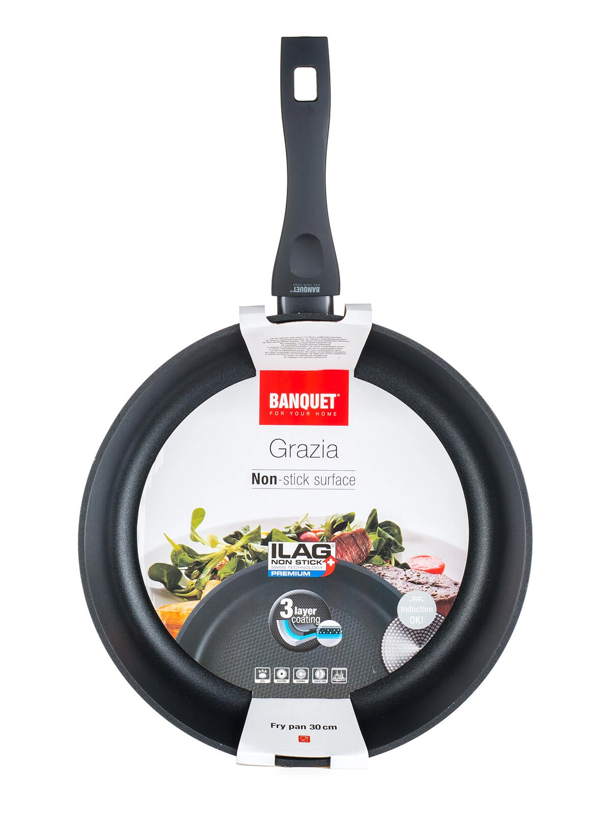 Kvalitets aluminiumsstegepande med en diameter på 30 cm med non-stick 3-lags belægning ILAG PREMIUM til madlavning uden fastbrænding. Den har forstærkede 4 mm vægge, induktionsbund til universel brug på alle typer komfurer og en holdbar 2-lags varmebestandig ydre belægning i elegant sort.