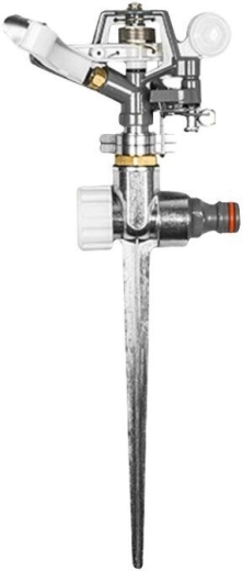 Pålidelig impuls-sprinkler på metalspids fra WHITE LINE til bekvem vanding af store arealer. Tilbyder justering af vandstråle, retning og rækkevidde med dækning op til 539 m² og en vandingsdiameter på 26,2 m.