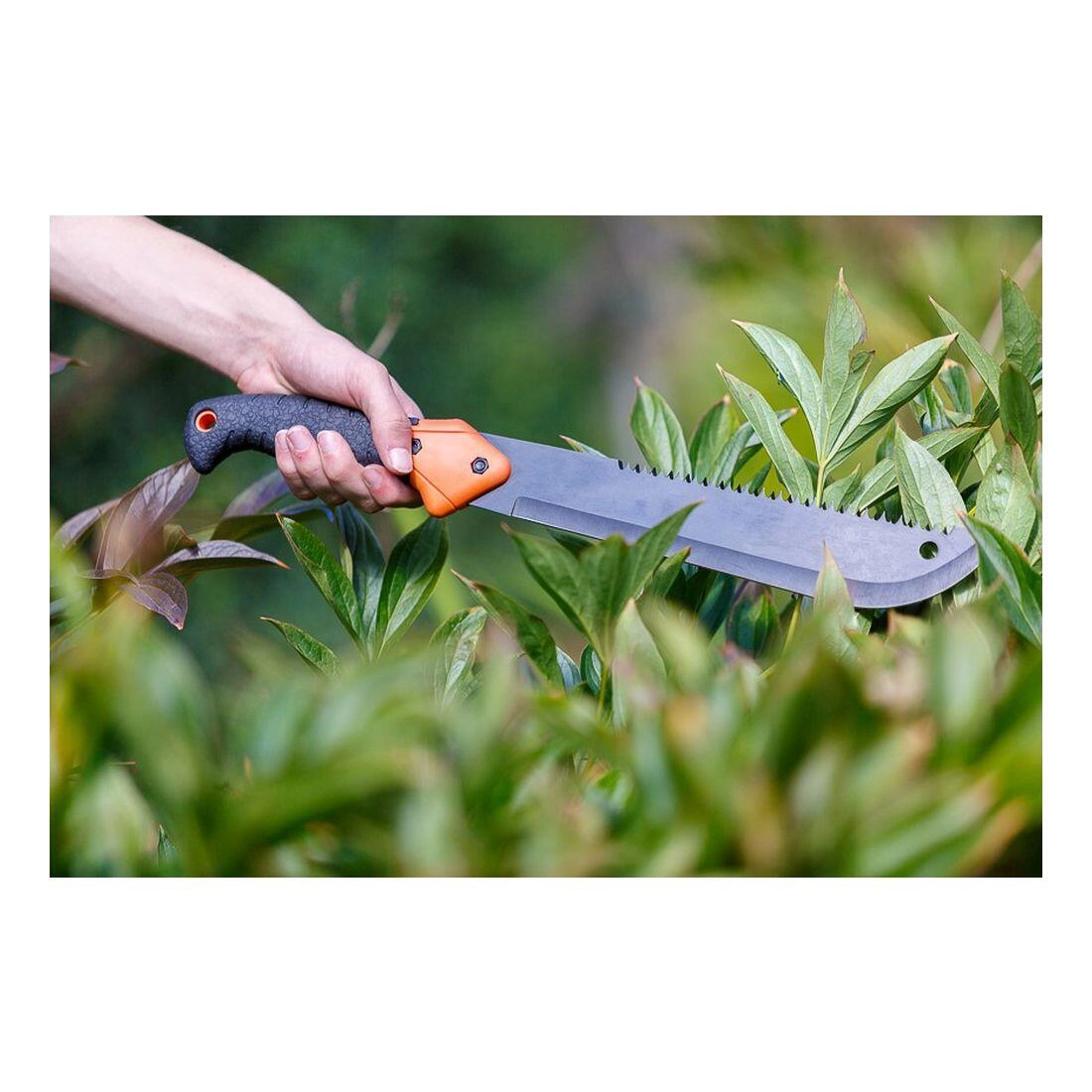 Universel machete på 49 cm til hurtig rydning af bevoksning, beskæring og camping. Kvalitetsblad af hærdet stål og en tandet rygsav klarer både skæring og grov hugning. Det skridsikre håndtag dæmper vibrationer og reducerer træthed, og nylonhylsteret sikrer sikker bæring.