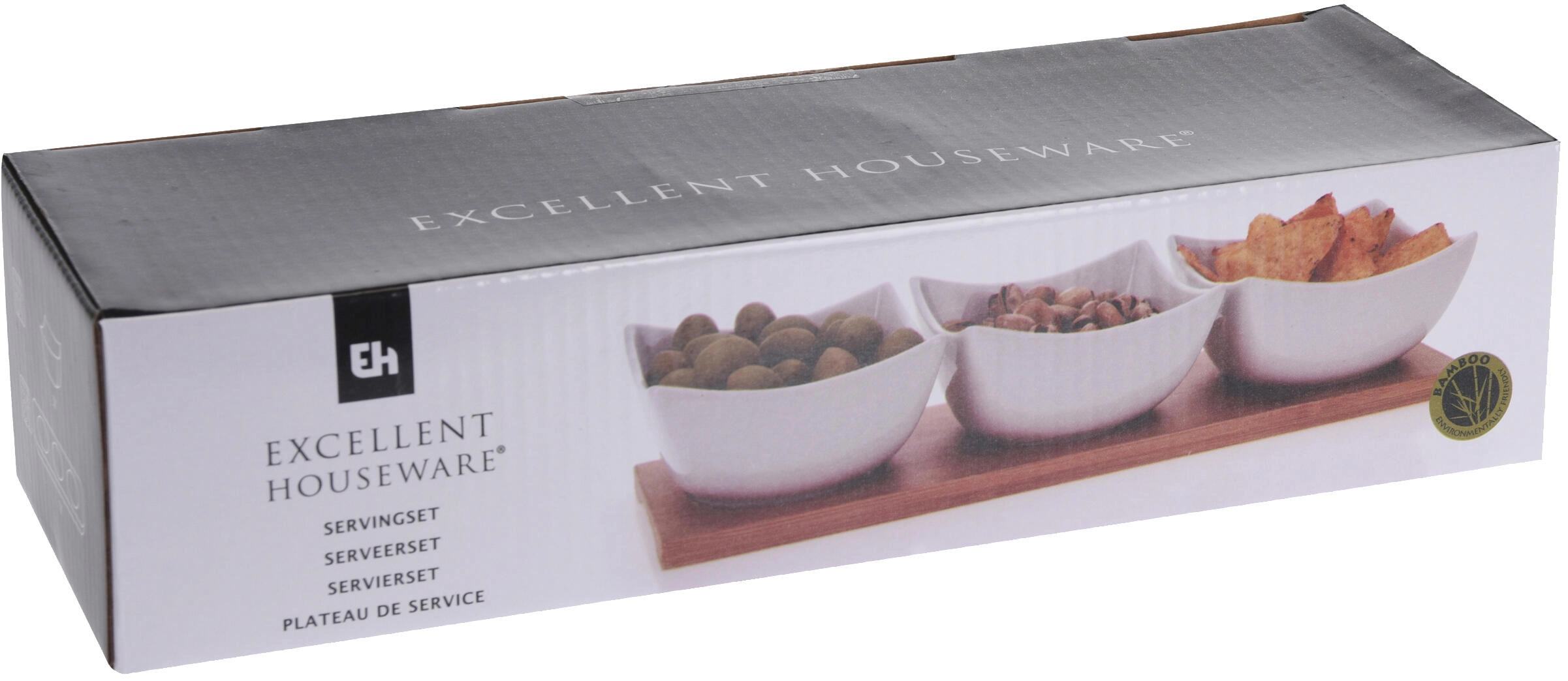 Stilfuldt serveringssæt til både hverdag og festlige øjeblikke. Indeholder tre porcelænsskåle i ren hvid farve og en bambusbakke til elegant servering af dyppelser, saucer og små lækkerier. Nem at kombinere med alt service og giver bordet et moderne udtryk.