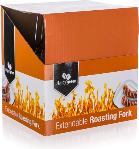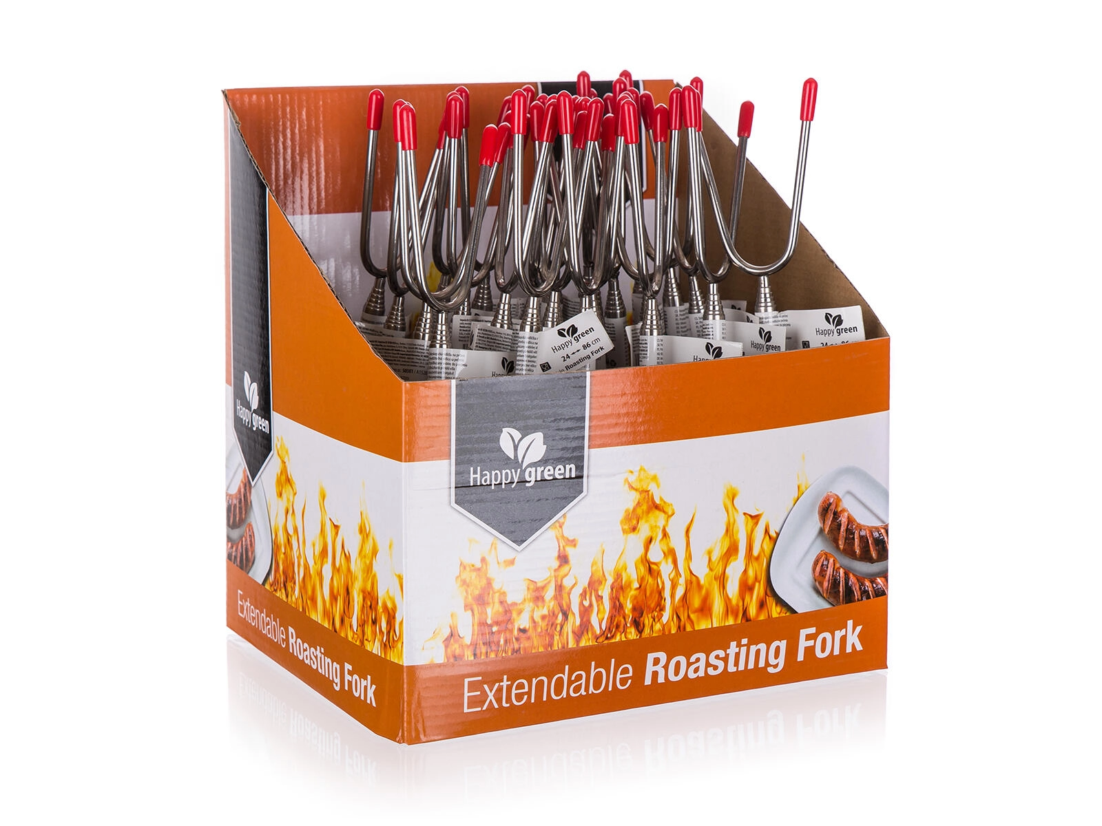 Praktisk teleskopisk grillgaffel med justerbar længde 24–86 cm i rustfrit stål og et behageligt PVC-håndtag. Ideel til ristning af pølser, grillpølser og grøntsager over bål eller grill, med to robuste spidser til sikker isætning.